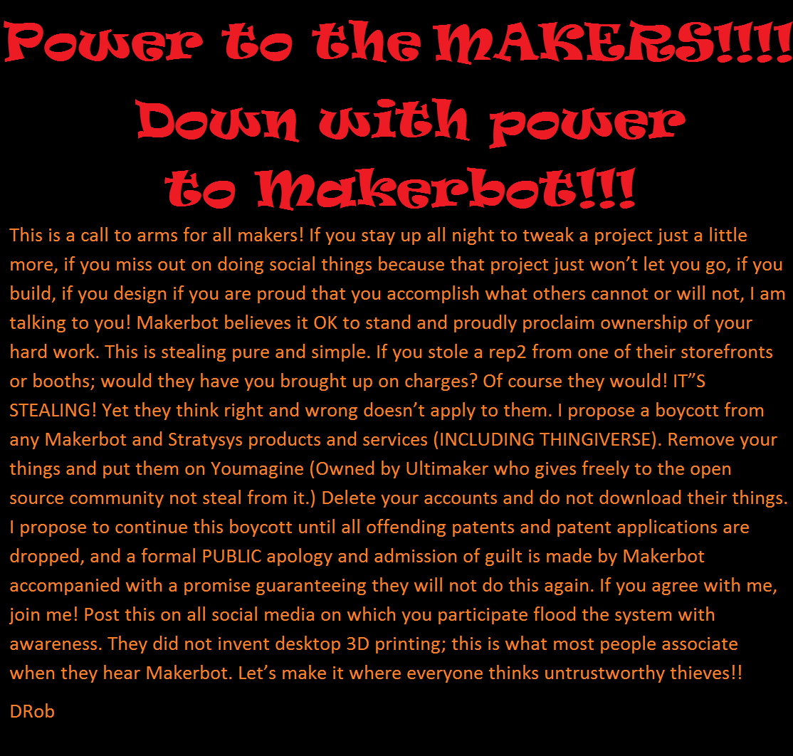 @Kienan_Vella @Paul_Frederick makerbot’s owner stratysys has proven that they will in fact sue competition. Ask Afina. There is a difference in doing business and breaching opensource licensing to patent someone else’s work