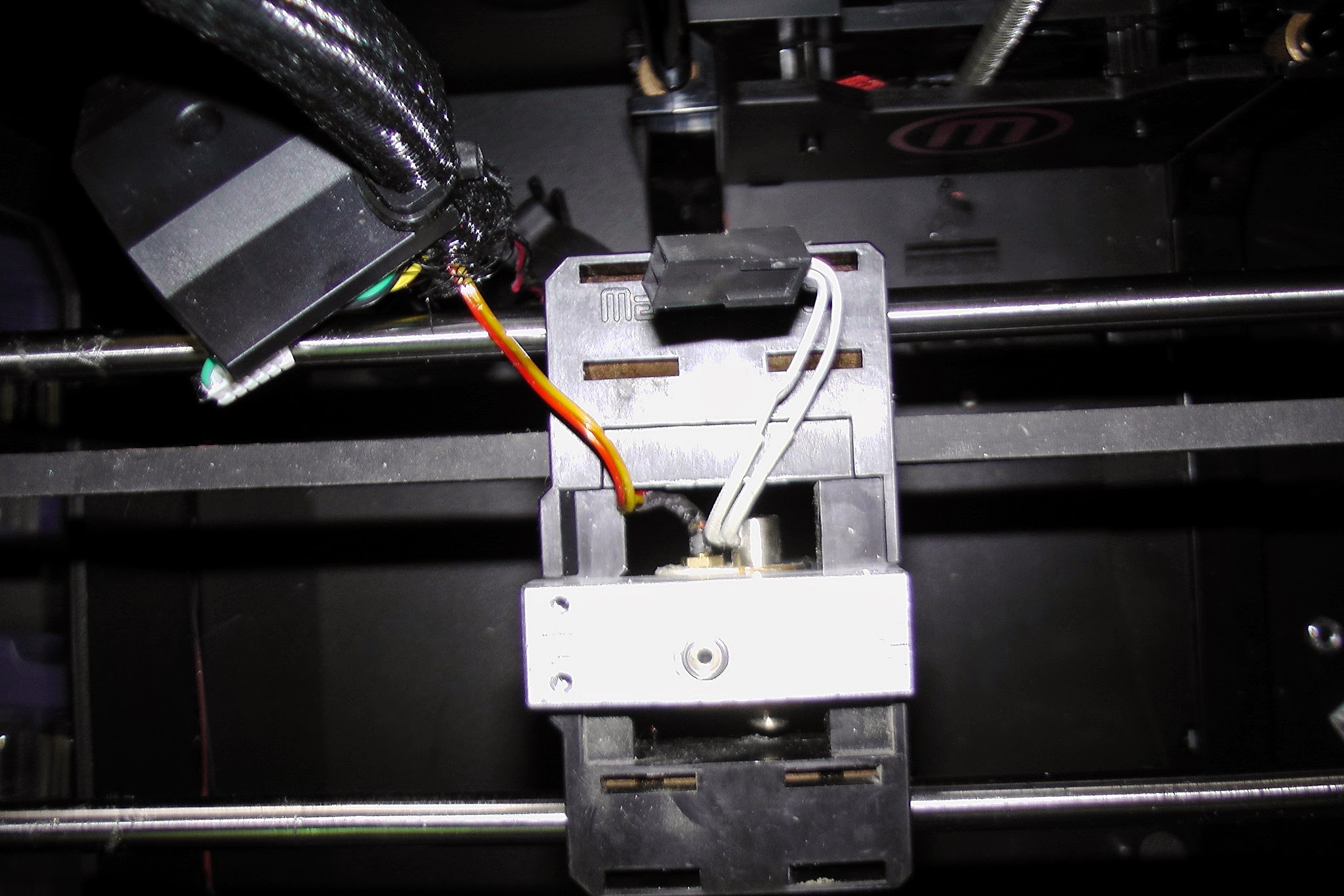 Makerbot support told me the thermocouple wires (here in yellow and red) should not bend… but there is no place for the cable to pass through.