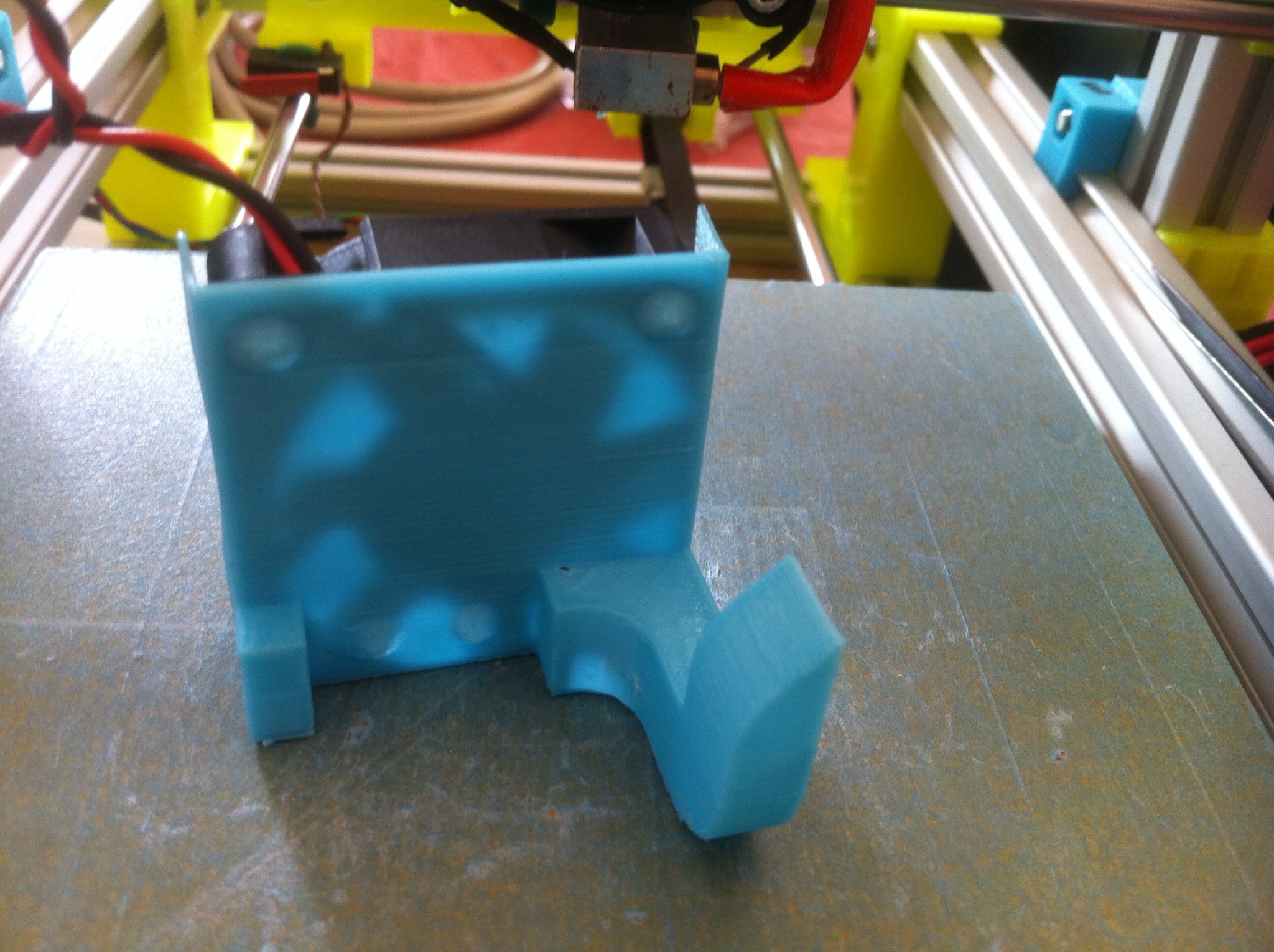 it’s the printer on the left, I’ve got two blower fans off to the side, blowing towards each other and a paper shroud around the hotend heaterblock to stop that getting cooled off. my idea here was air coming from two directions meeting in the middle slightly offset would cause a sort of whirlwind effect around the nozzle, giving an more even airflow on the part itself than just a single fan. it sort of worked, but not as well as I’d hoped, also pid control on that ended up me sticking a wire in different spots on a breadboard with different resistors o_O.