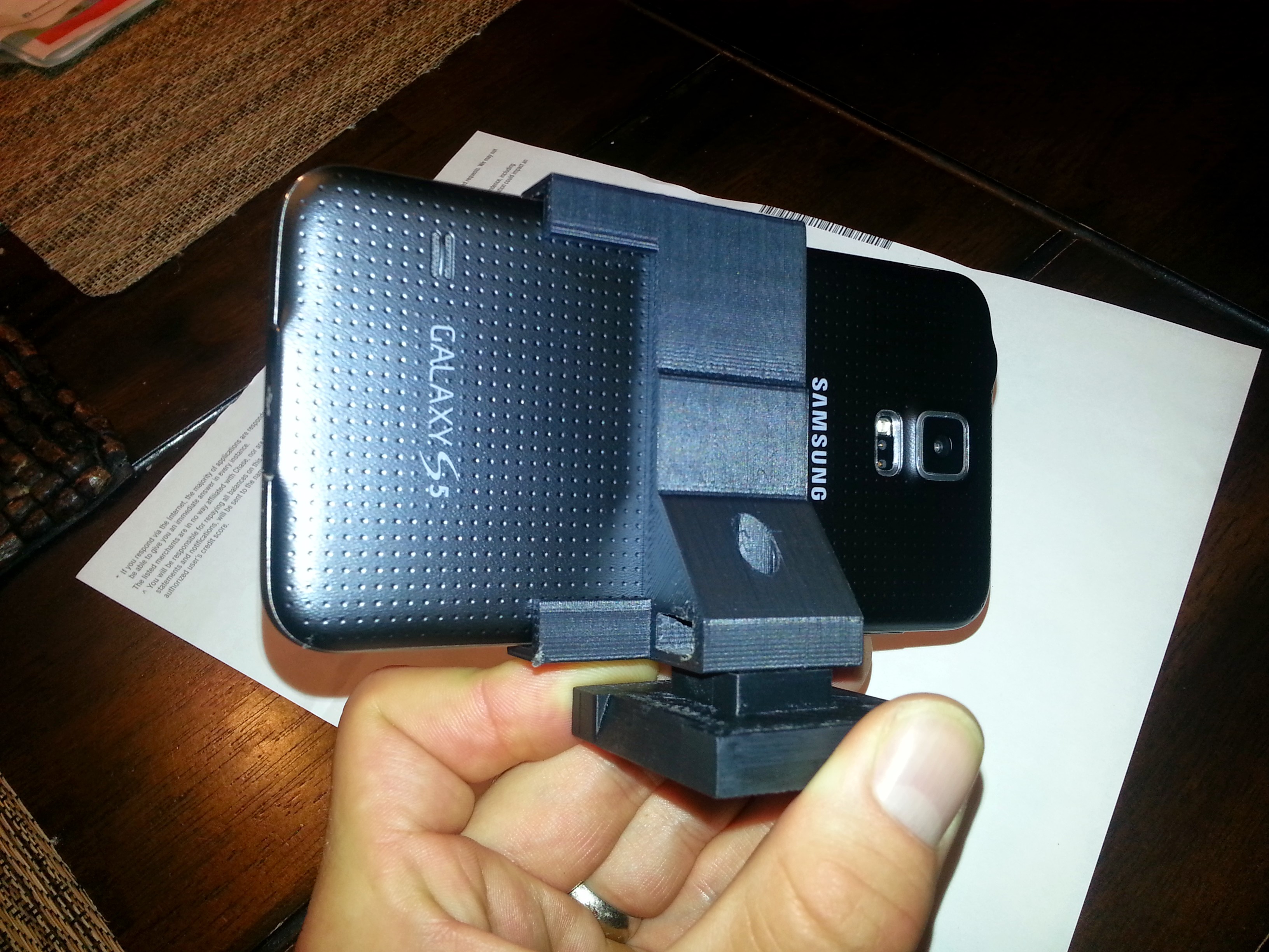 Took some pictures of my 3D Printed Galaxy S5 Tripod Mount. The mount has a slot for a standard nut that fits the 1/4 inch threadings on a camera post, so that it will work on any tripod (or anything that mounts a camera).