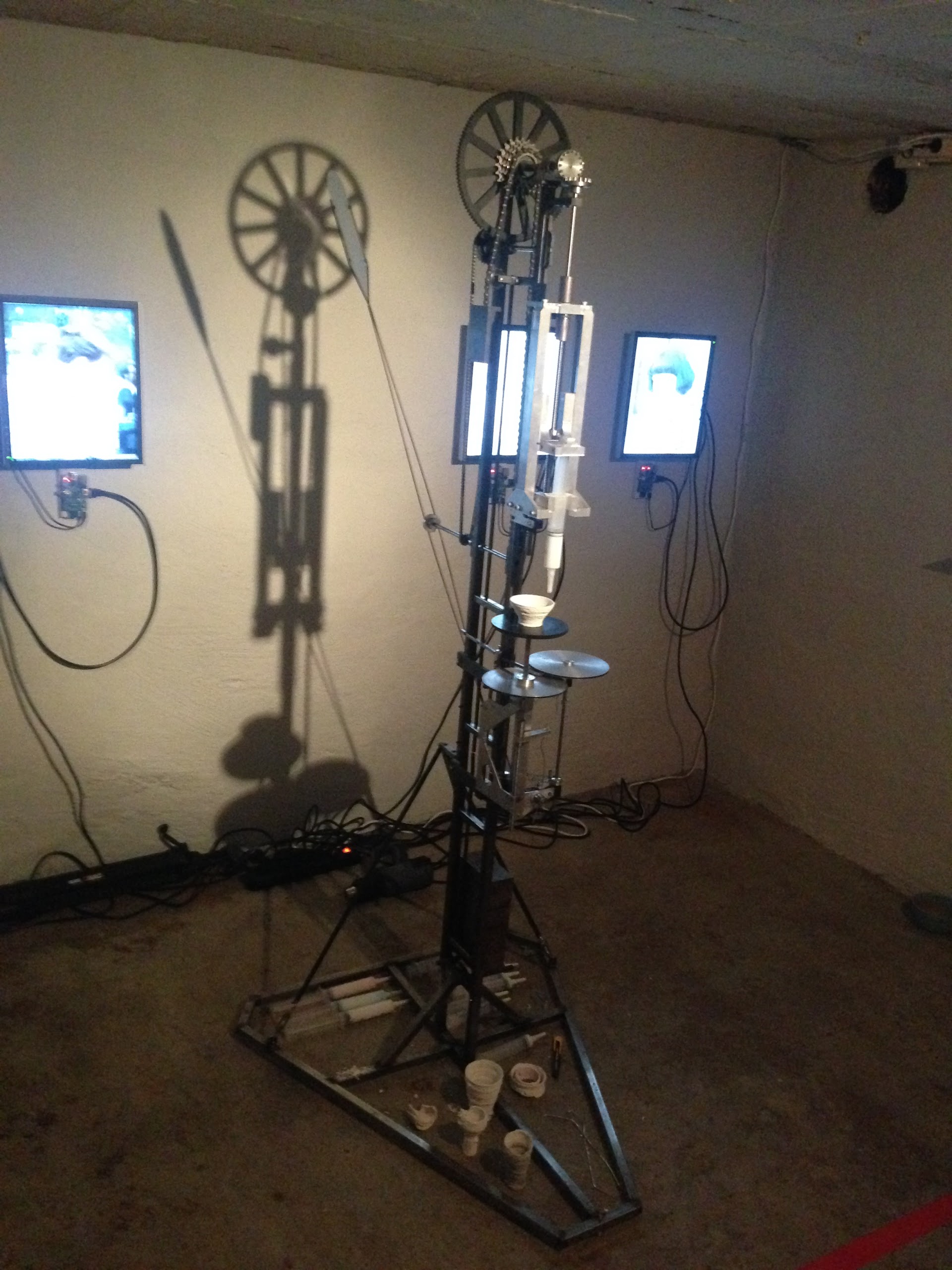 Today was its official opening day in its new life, as an art exposition room. Daniel has been inspired by 3D printers and the maker movement, and has built a completely analog 3D printer (pictured). The drive mechanism is obviously inspired by eighteenth century click tower clicks, in particular the striking mechanisms: a raised weight, and some rotating wings that provide a slowing force via air resistance. The rotating motion is then transferred to a rotating platform, which moves underneath a large syringe which squeezes out a wall filler material. Each rotation, the platform (held up by a screw) moves down a bit.