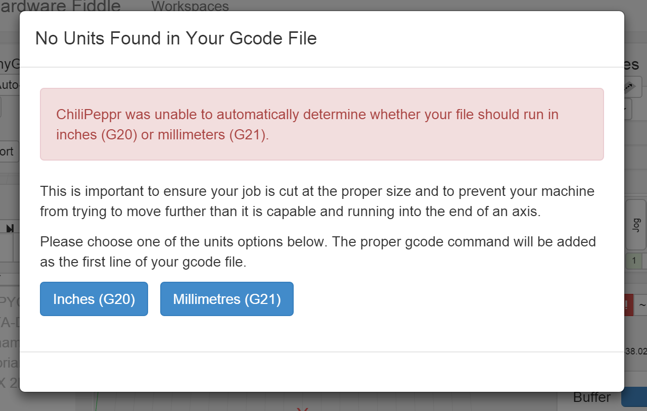 New units dialog box in ChiliPeppr. If you drag in a Gcode file without units specified, ChiliPeppr now saves you. Thanks to @Jarret_Luft for forking the Gcode Widget and making the changes for the rest of us to benefit from.
