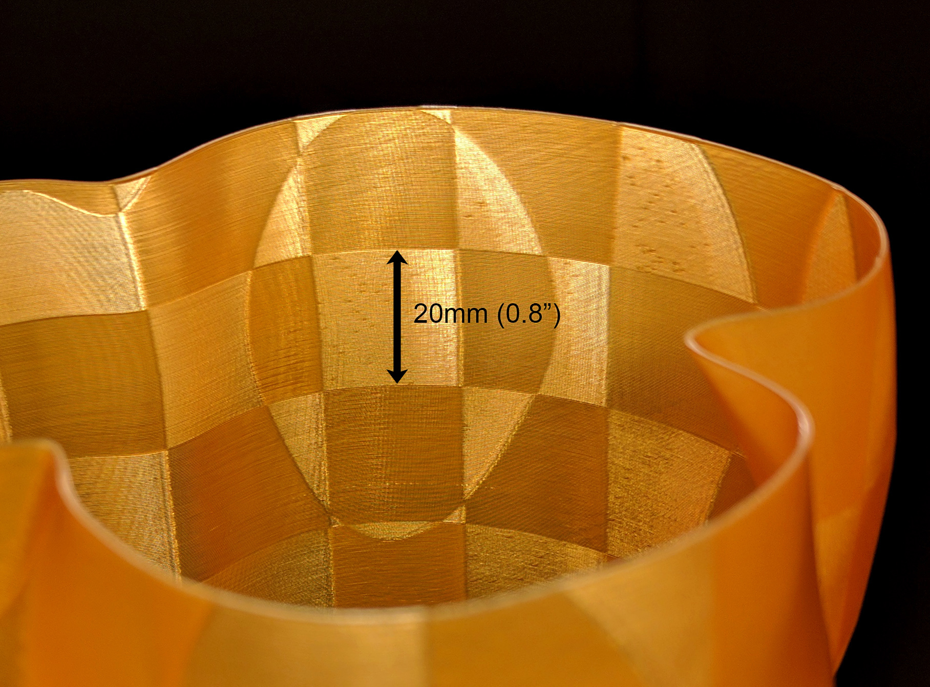 15mm/s for the shiny surface, 35mm/s for the matte. 210C nozzle temperature, 0.2mm layers in spiral vase mode, 0.5mm perimeter. Sliced in Simplify3D and then passed through a rough ‘n’ ready perl script.