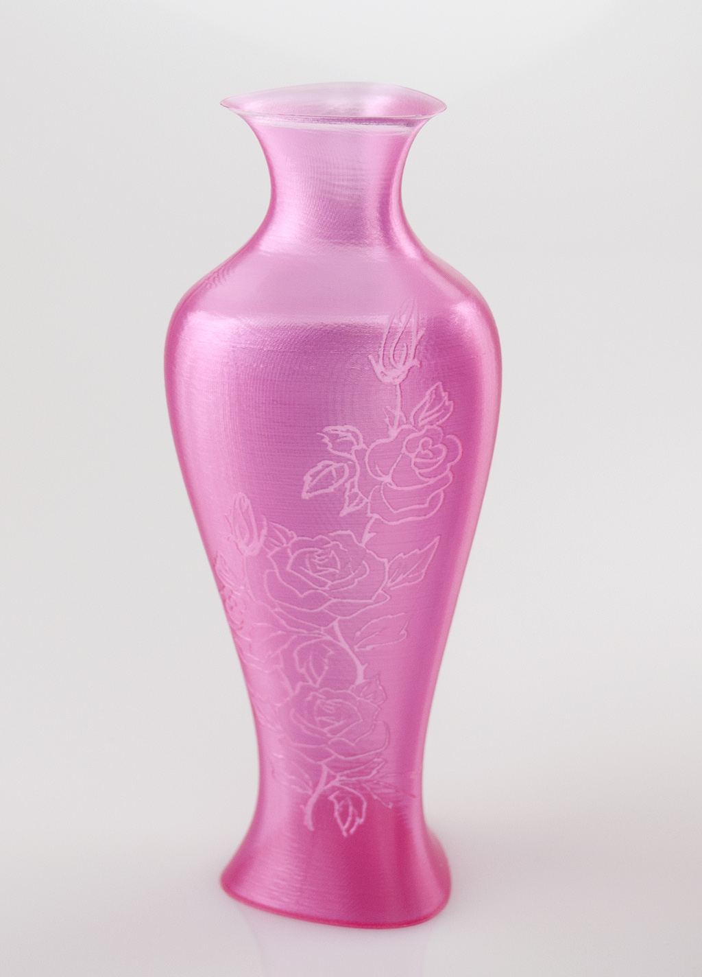 This is post-processing, so the vase (own design at Curvaceous Vase by markwheadon - Thingiverse) is unmodified and sliced pretty much as normal, with the rose drawing applied to the GCODE file before printing using a perl script to split vectors where they cross pattern boundaries and then tweak the print speed according to the pattern. The rose pattern goes through the vase like letters through a stick of Blackpool Rock, so there’s the same pattern but reversed on the rear side of the vase. Beautiful.