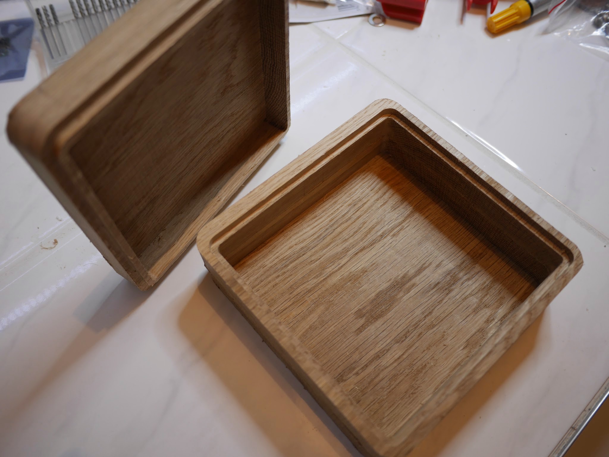 Here’s an oak box, made out of a reclaimed bit of oak flooring. Used a 6mm endmill to pocket it, and a 3mm one to cut it out.