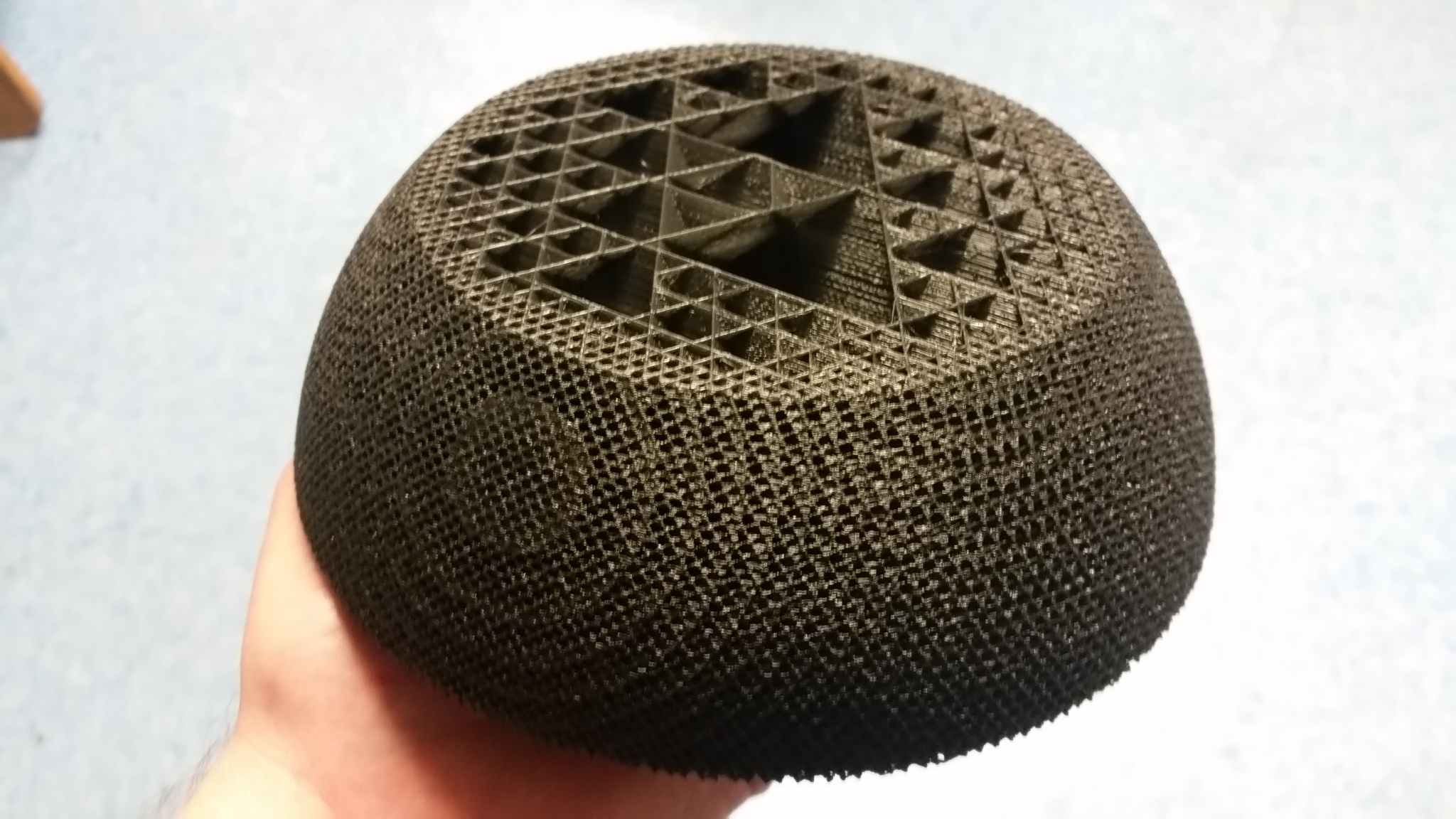 I printed this section of a sphere to show the internal structure of Cubic Subdivision Infill in Cura2.4+. I had an aha moment when I realized the infill was dense enough at the surface to not need walls. I don’t expect to do it often but it is incredibly strong and has an interesting texture.