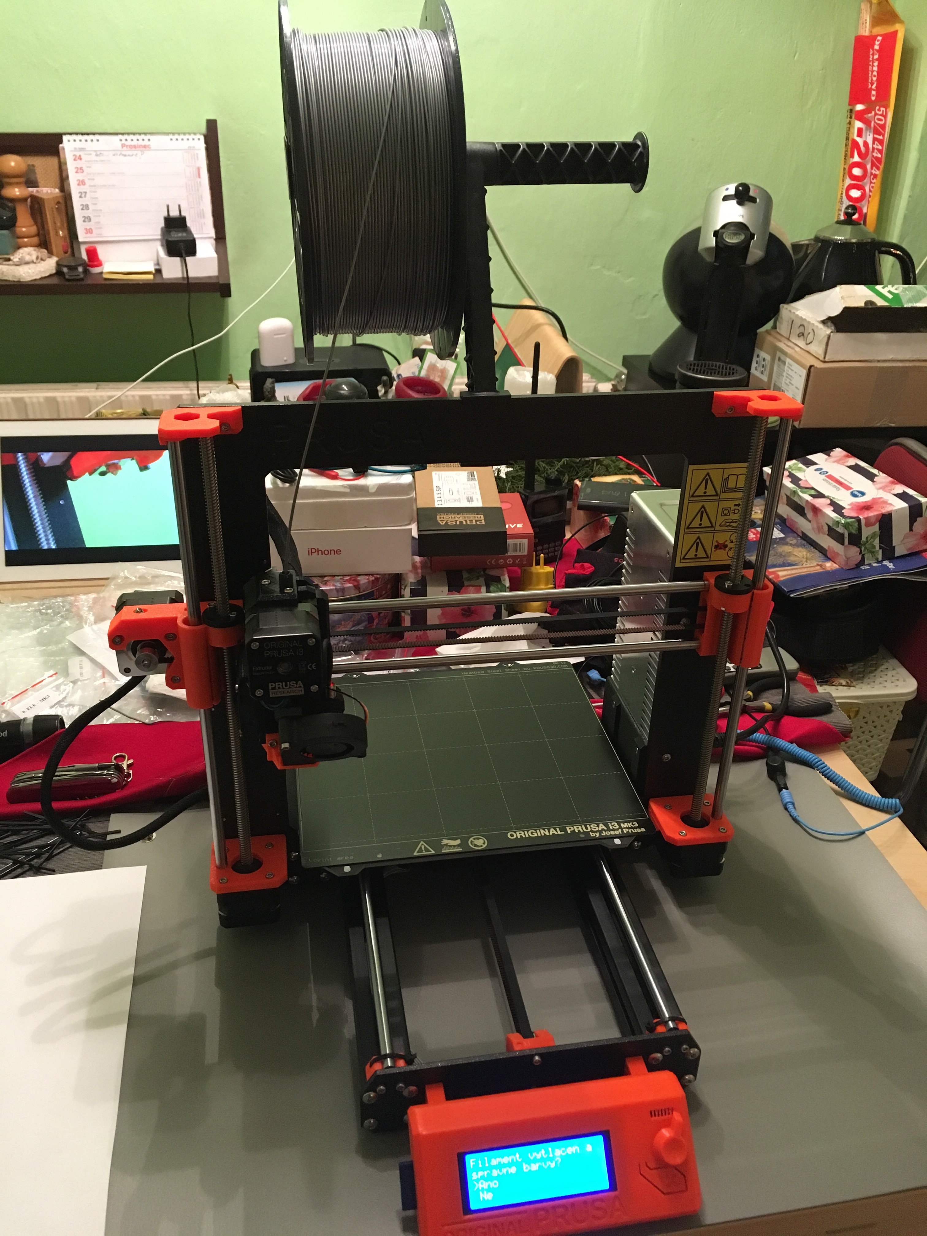 Prusa i3 Mk3 is assembled, finished, done, ready! 15hrs of work in kitchen laboratory. 🤦♂️ First printing is ongoing…