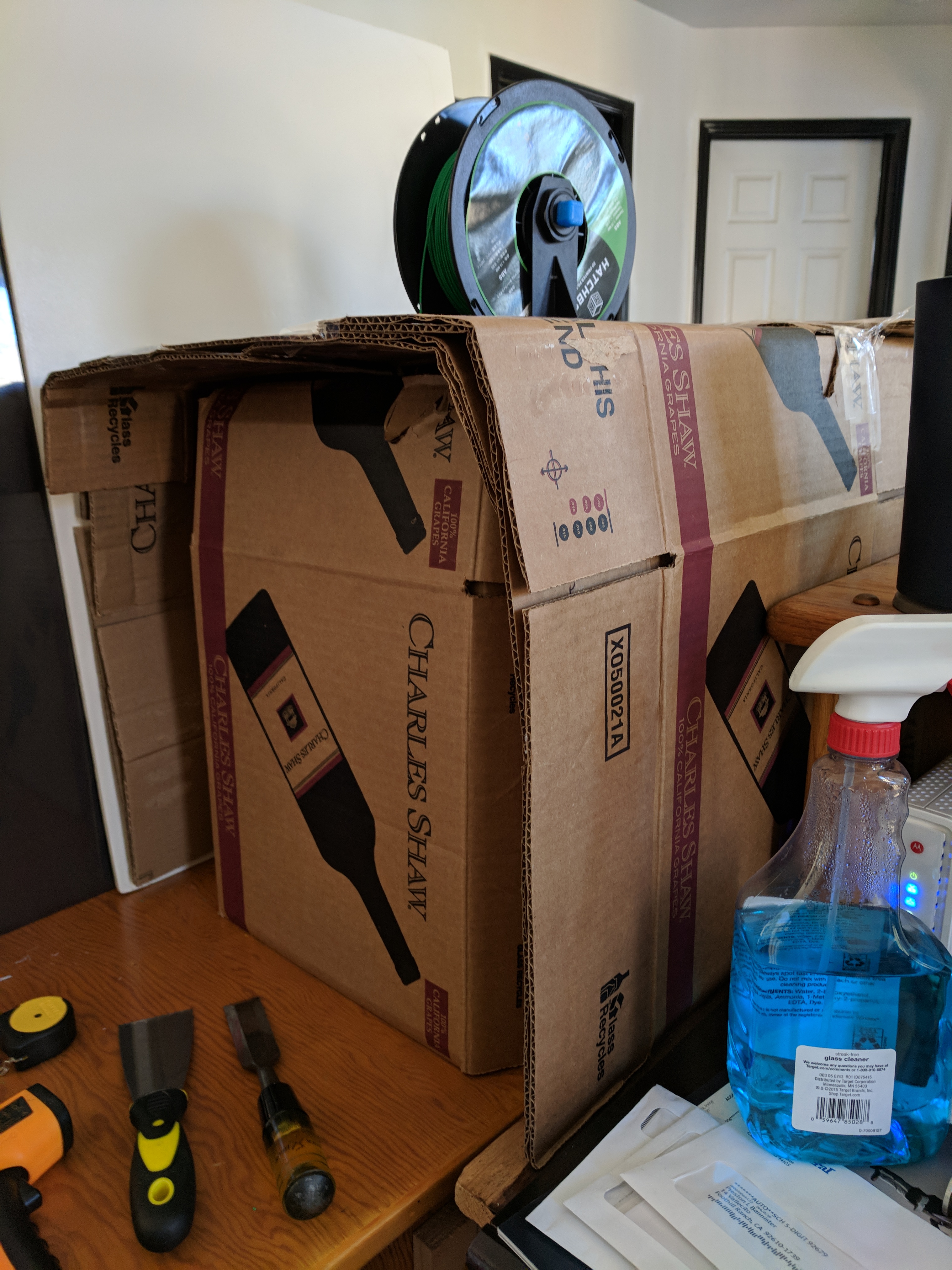 Built a (very) ghetto enclosure (below) to see if it would help. It did. Was printing parts for a proper enclosure, until my printer malfunctioned…