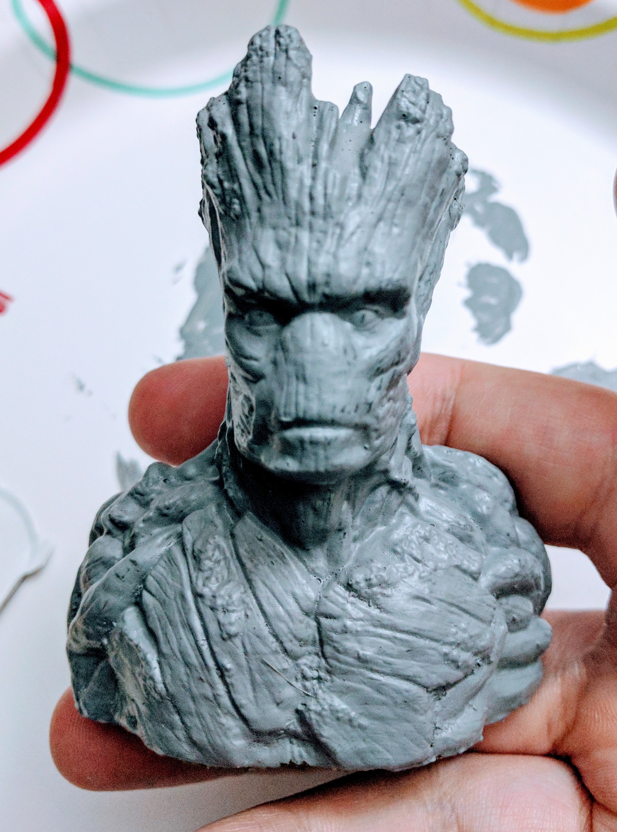 The same Groot from the other day, printed on my YHD-101 with FunToDo unpigmented Industrial Blend at 6s/layer and 0.05mm layers, now with gray gesso primer so you can see all the surface detail.