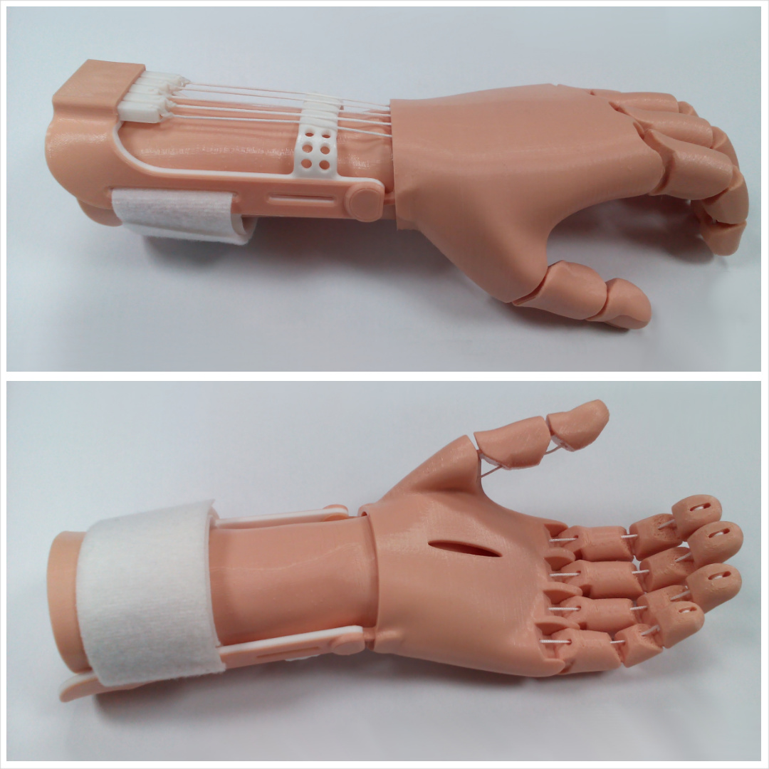 Recipient’s scanned limb printed with internal “bone” and wrist articulation. Using variable density “Modifier Meshes” in Slic3r.
