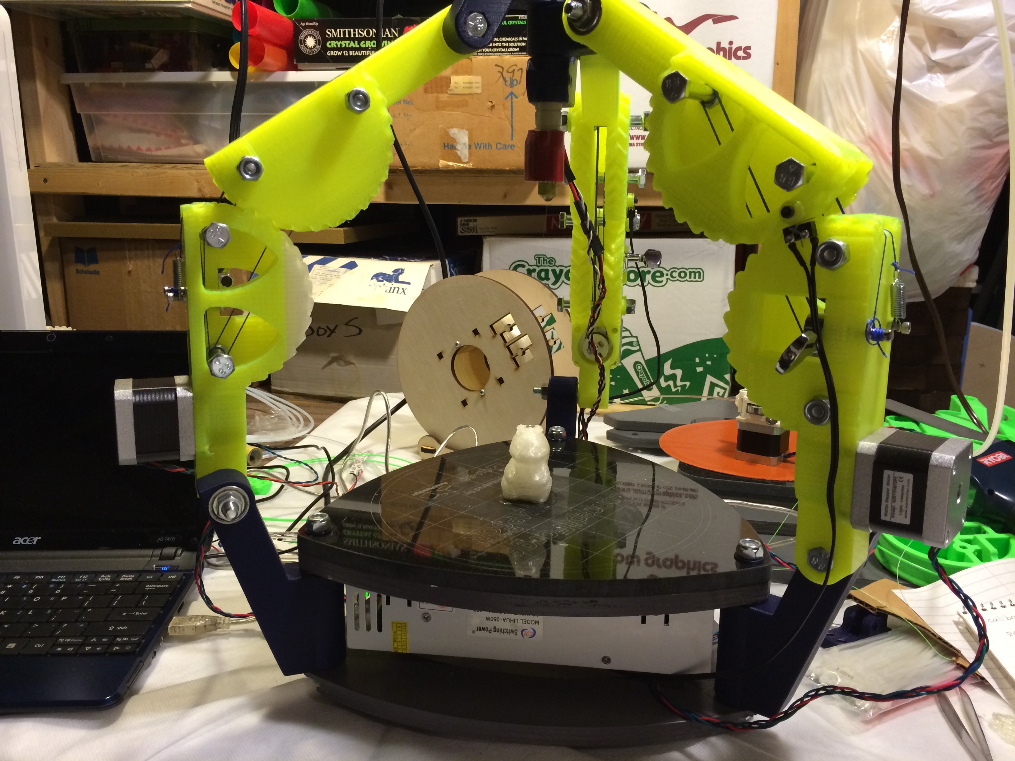 @Nathan_O_Kane It’s less complex than you might think; each arm has four pieces (shoulder at the bottom, motor arm, slave arm, and hub) and the only vitamins required are bolts and ball bearings. There are no linear components of any kind, and as a result this design has one of the highest - or perhaps the highest - percentage of printable parts. If there’s another contender for that title it’s probably Simpson’s “brother”, Wally.