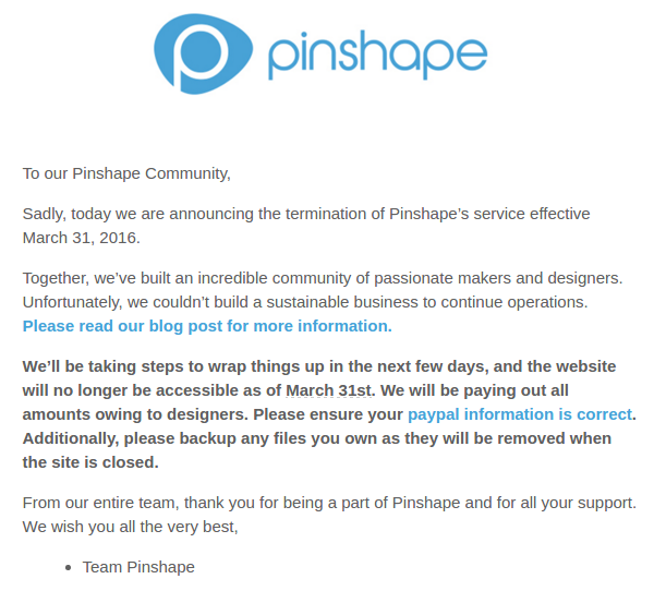 Just got the notification in my inbox. Pretty sad, but I can’t say it is a surprise. They have obviously been dumping money into the site (the number of giveaways and contests in such a short time was incredible), but it seemed like they got very little traffic out of it. Objects with thousands of views on Thingiverse would have tens of views on Pinshape.