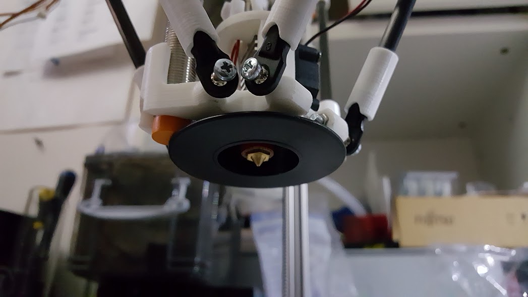 The spool is cut in half and fits into the center with M3 set screws. Assembled unit is just nylon cable spool, the other unassembled unit has the nylon shield and a small section of aluminum bicycle handlebar. I can mount the cut off wire spool or the aluminum tube or both for a double walled heat shield. Both block heat from the heater to the effector to hopefully keep it from warping. They are both pretty light, spool is around 8gm with 12mm of center tube left, 5gm cut in half with about 6mm of center tube. Aluminum handlebar end cutting is 5gm.