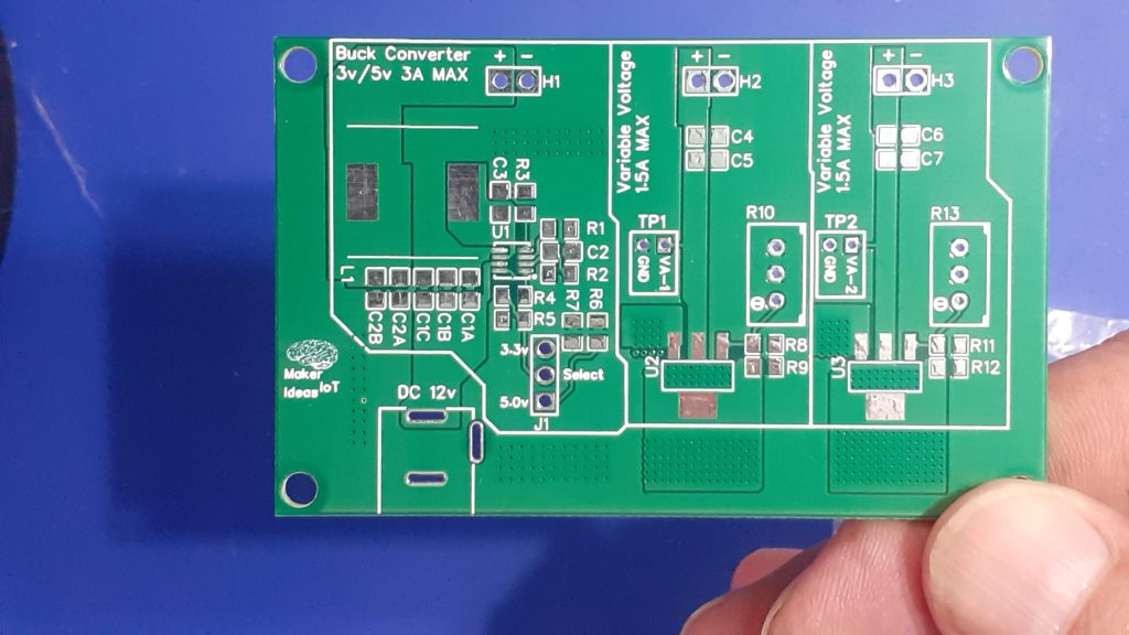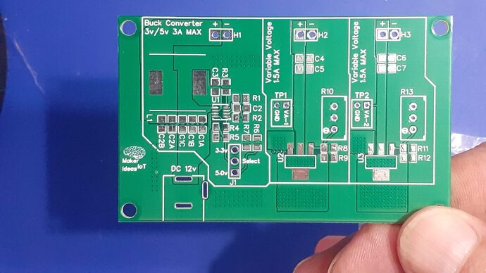 The PCB consists of 3 independent power circuits, the first of which is a DC-to-DC Buck module, based on the MP9943 from MPS. This chip can source up to 3A at a preset voltage. In my case, I chose 3.3v and 5v, as I use those the most.
