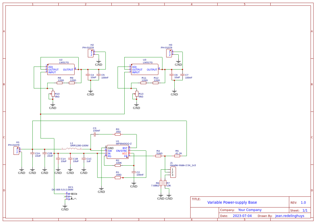 The idea thus came to me to combine two recent projects, that I have been using together on the bench with great effect. These two are the Variable Breadboard Power Module, based on the LM317G, and the DC-DC Buck Converter that I designed a short time ago. Between these two devices, I can deliver up to 3A at 3v or 5v, or a variable voltage at up to 1.5A.
