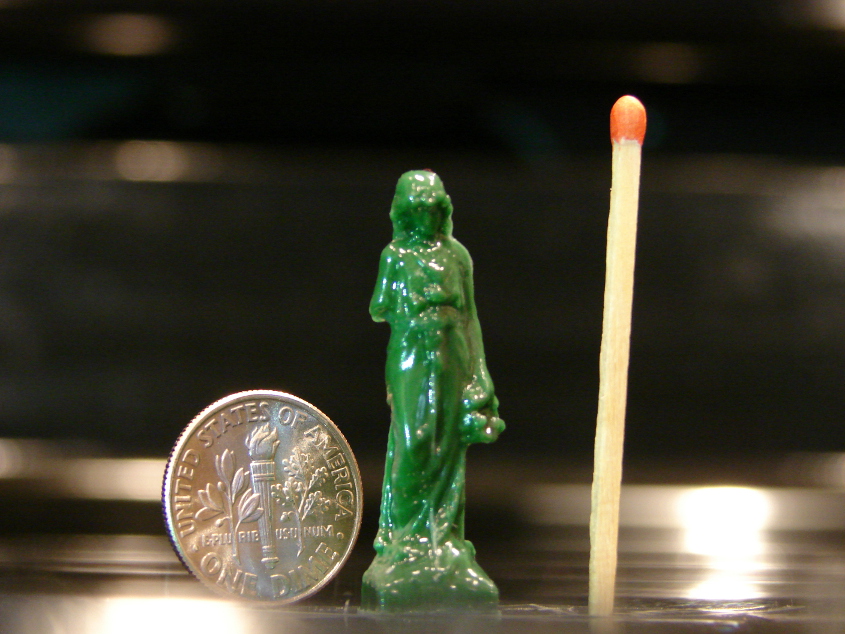 Printed a copy of the cemetery statue from Thingiverse at http://www.thingiverse.com/thing:26317 printed using a 0.10 mm http://www.jerrill.com nozzle on a Printrbot PLUS. And yes, you can balance a matchstick on it’s end with the help of some tape.