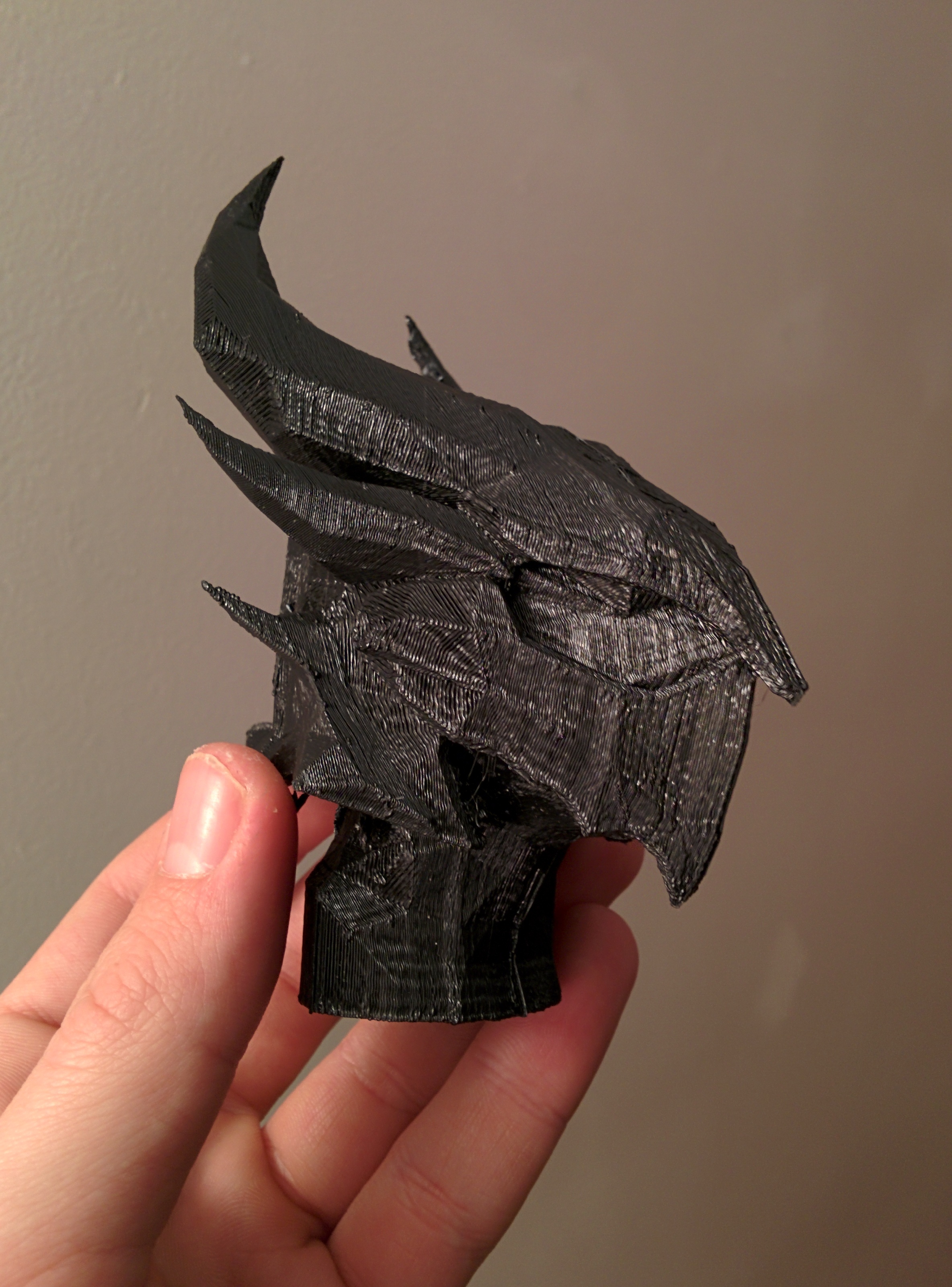 Printed a Daedric Helmet from Skyrim. This is the raw file (aside from flattening the shoulders) that was surprisingly easy with a file extractor made for Fallout. .15 layer height on a Bukobot Duo.