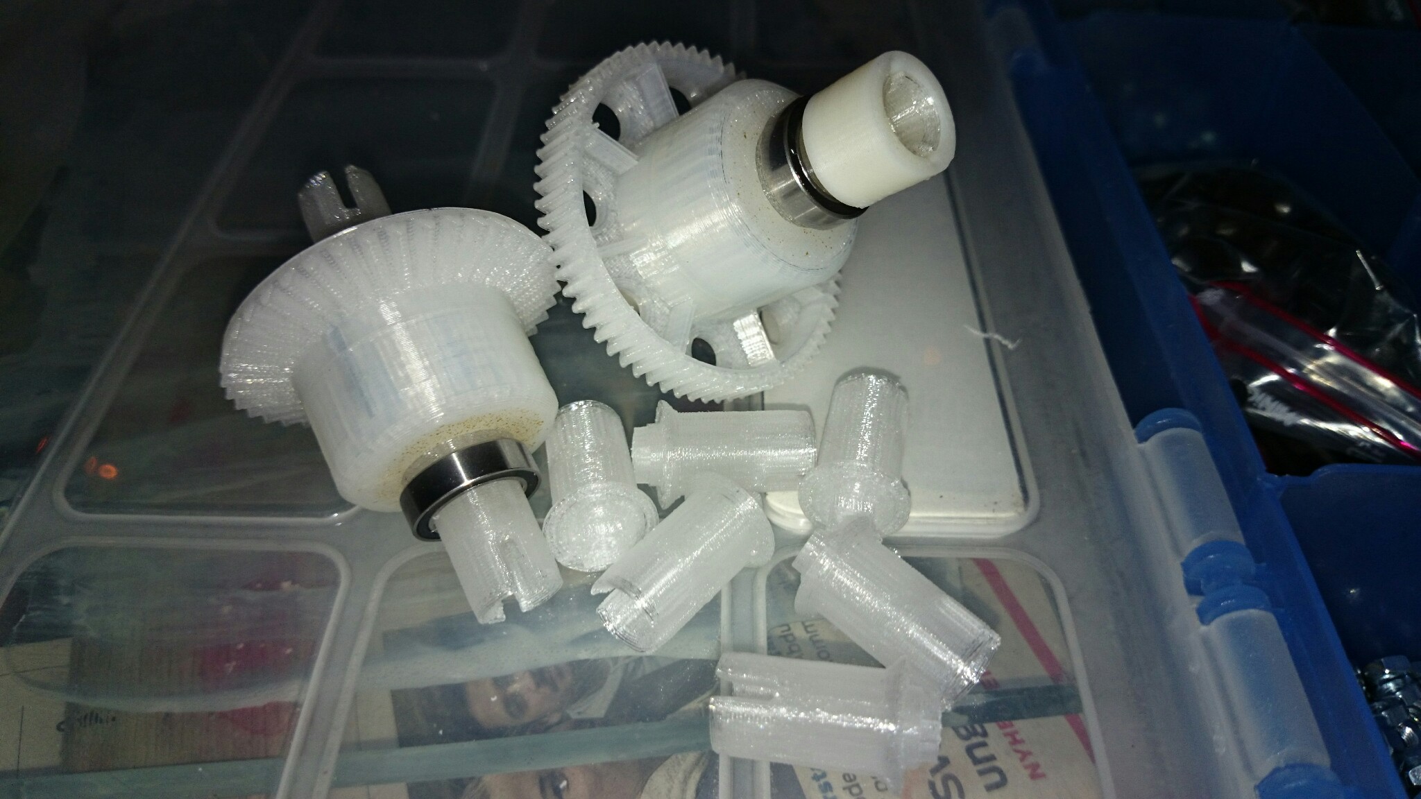 Printed new diffs. Gears are ABS, case is Taulman Nylon 645 and axle shafts are Polycarbonate. Running nice and smooth. Can’t wait to try and break them!