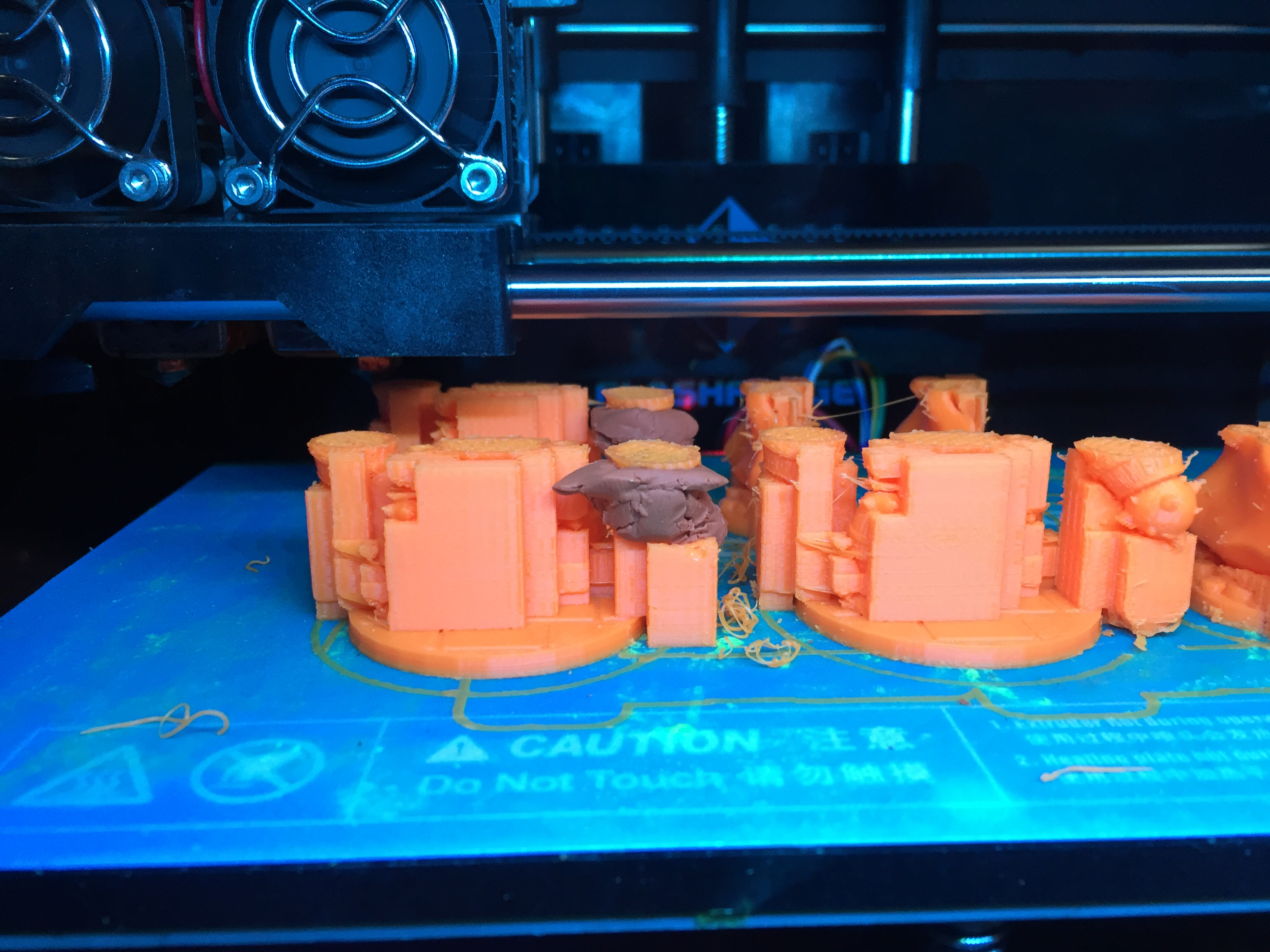 Printing in ABS, I came back from my walk and the weapon arms of two of my three golems had failed to fill in over the external support and it was drooling spaghetti for those arms. With some plasticine modelling clay I tried rescuing support on the arms of those models. I want to at least prevent spaghetti dragging further into neighboring models, and possibly have enough of them for me to scratchbuild the missing weapon hands. Paused the print, cleared the mess, and shaped a ball of plasticine for each to have a flat top that aligned with the printing plane. One took on the first try, the other didn’t stay stuck well enough printing over the plasticine and was semi random for a few levels from dragging loose. After a second pause, and redoing the second plasticine support, both are printing well again for the remainder.