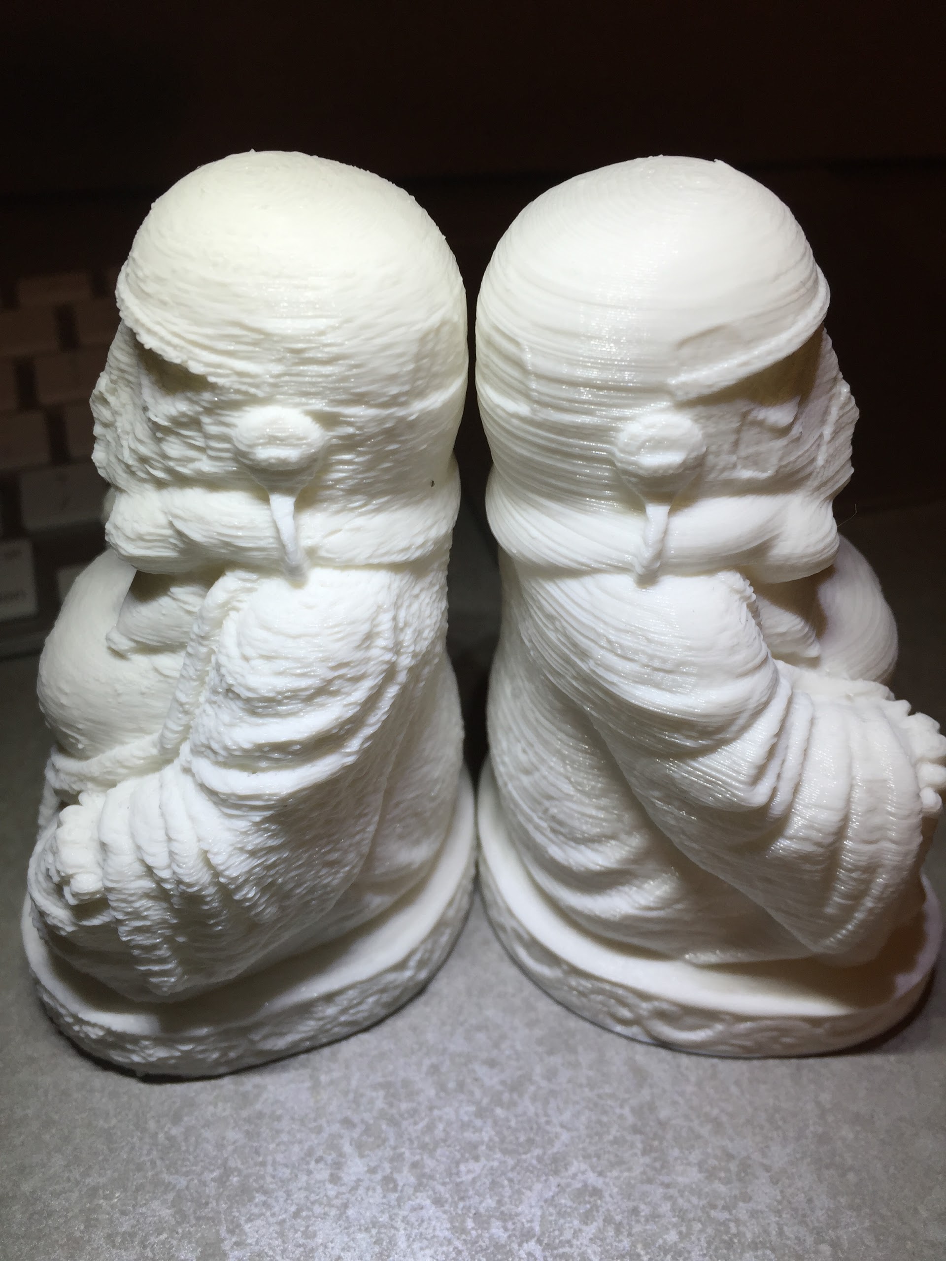 Printrbot simple metal, the one on the left was sent wirelessly with octoprint, the one on the right direct connect. Why does the one on the right look like oatmeal?