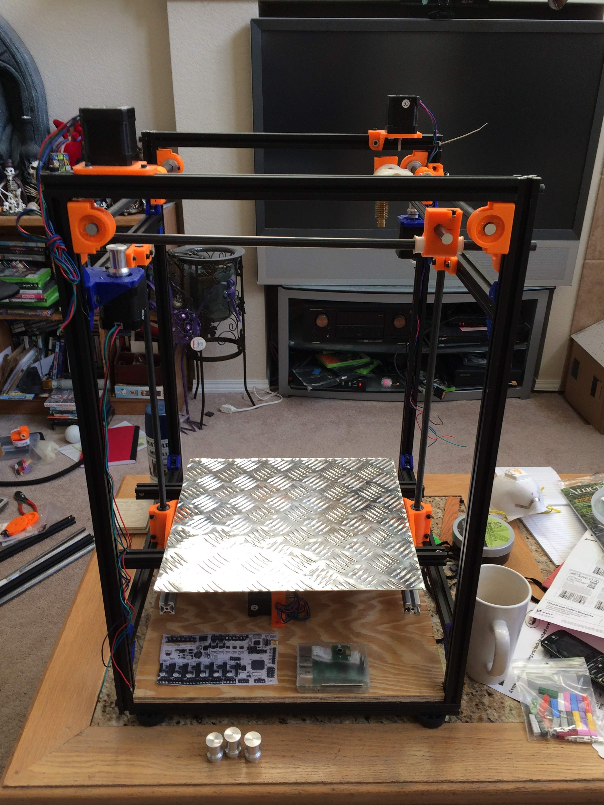 So, between the time I took pictures, and started this post, I’ve decided to go Eustathios for XY…doing so immediately simplifies electrical runs (everything is in the base of the printer) and I’m back up to an 11"x11"x14.5"" envelope.