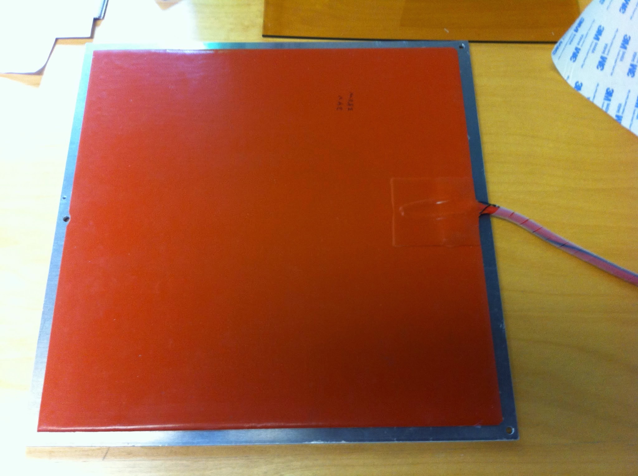 finally found time to install the heater, it’s a custom made silicon heater from AliExpress. 330x300mm, 350W, 24V including thermistor and adhesive tape for 40$ (including shipping). It works great but takes quite long to heat up due to heat dissipation and the mass of of my build plate (350x350x6mm). I guess this is normal for a bed of this size. 350W might be a little bit to low, it reaches 90°C in about 10min, max is 100°C (thermistor reading). On the top surface I get about 90° (measured with cheap temp. measuring gun).