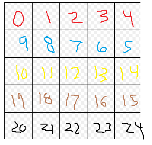 Question about grouping WS2812B LEDS. Right now i am working with a small 5x5 LED matrix arranged in a horizontal snake pattern starting at the top left (See picture bellow). What i would like to do is display small animations/ pixel art onto the matrix. For instance if i wanted to display the letter “X” on the matrix I would simply write it as