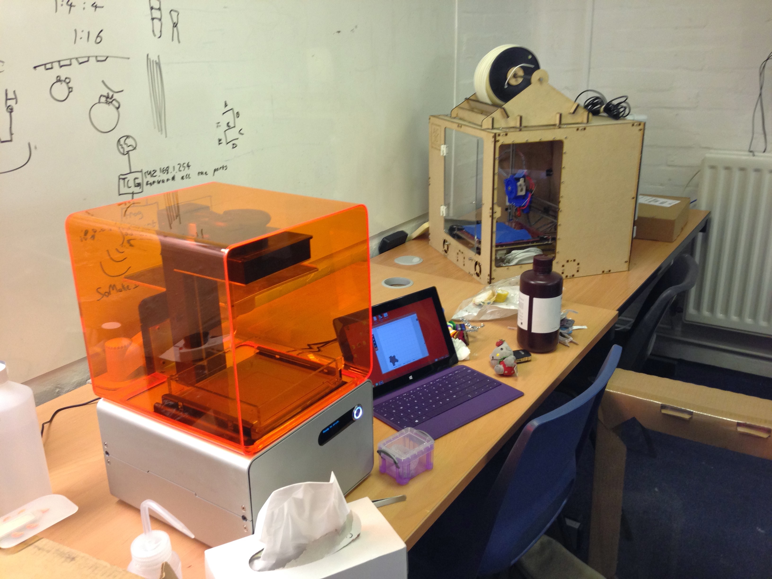 Quite a mix of printers at the Southampton RepRap User group today. The wooden box is a “school safe” Prusa i3, there’s my i2 next to a pile of fail as apparently ABS stopped sticking to Kapton at the end of 2013 and a Formlabs, which is every bit as hard to use as a FFF type printer as it proved when the parts kept falling into the juice.
