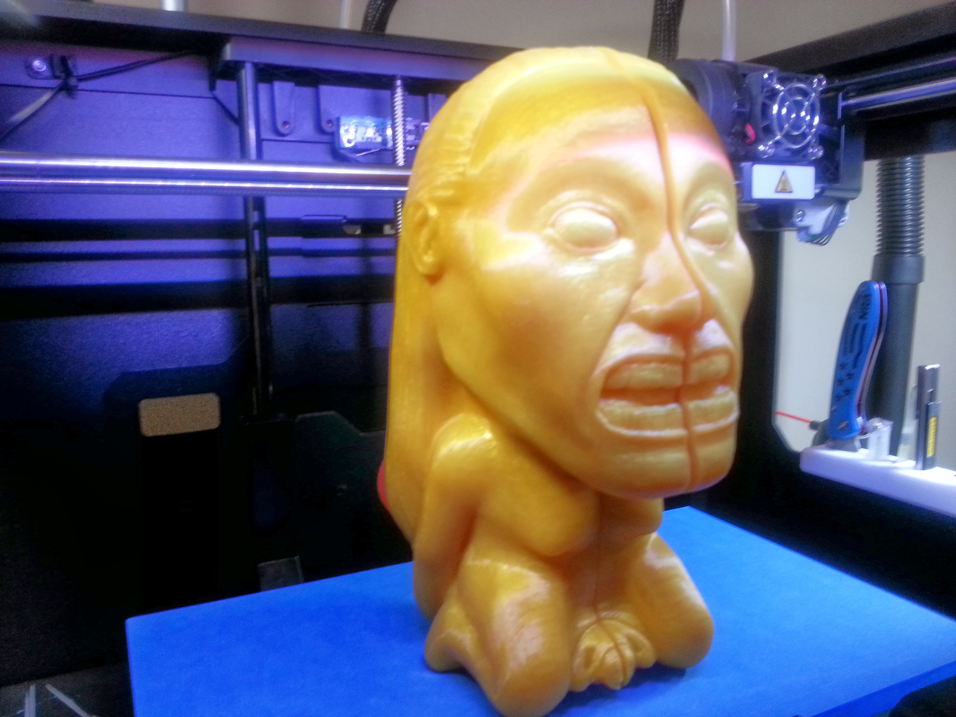 This is the kind of thing the MakerBot would build, laying down, epoxy together, and spend a ton of post-processing time hiding that seam, and place upright on their bed with a do-not-touch sign…