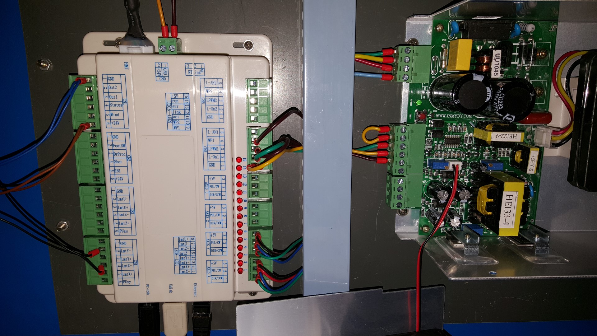 Moving on, the controller output seems to be marked “Lout” which is Laser out or Low out (possibly refering the logic state for the output.) Not sure which. It’s connected to (hard to see for sure) a green wire which goes to pin 3 of your old supply. This probably is your Laser fire, and is probably active low logic.