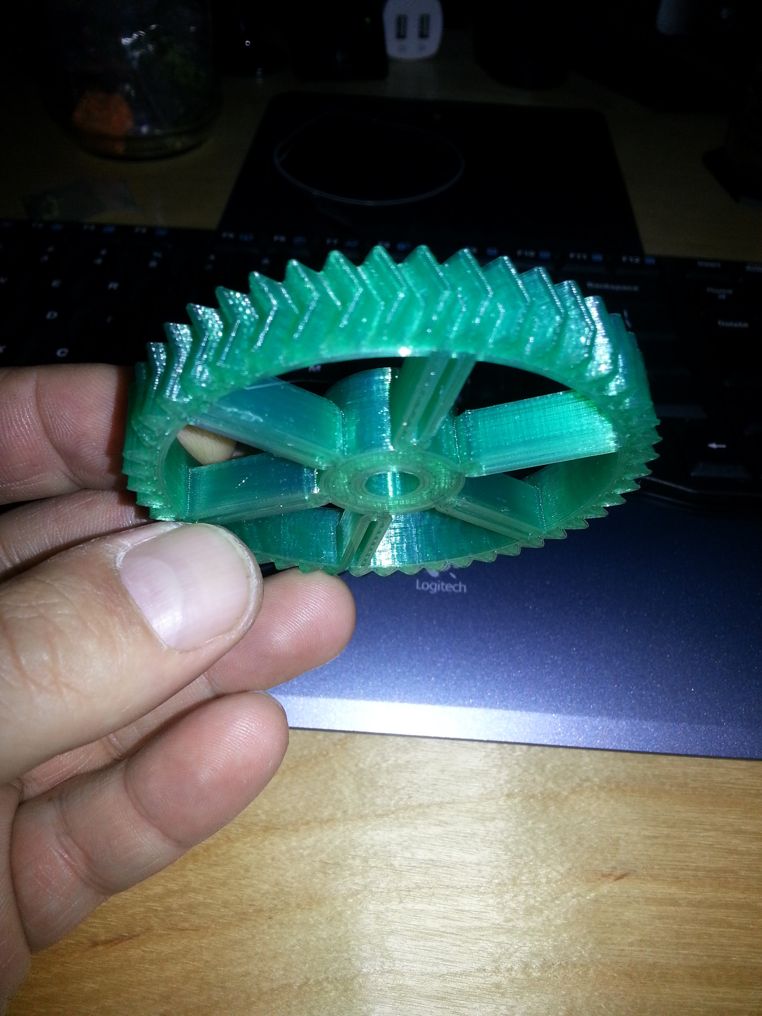 Redesigned herringbone extruder gear. Inspired by low profile car rims in emerald PLA.