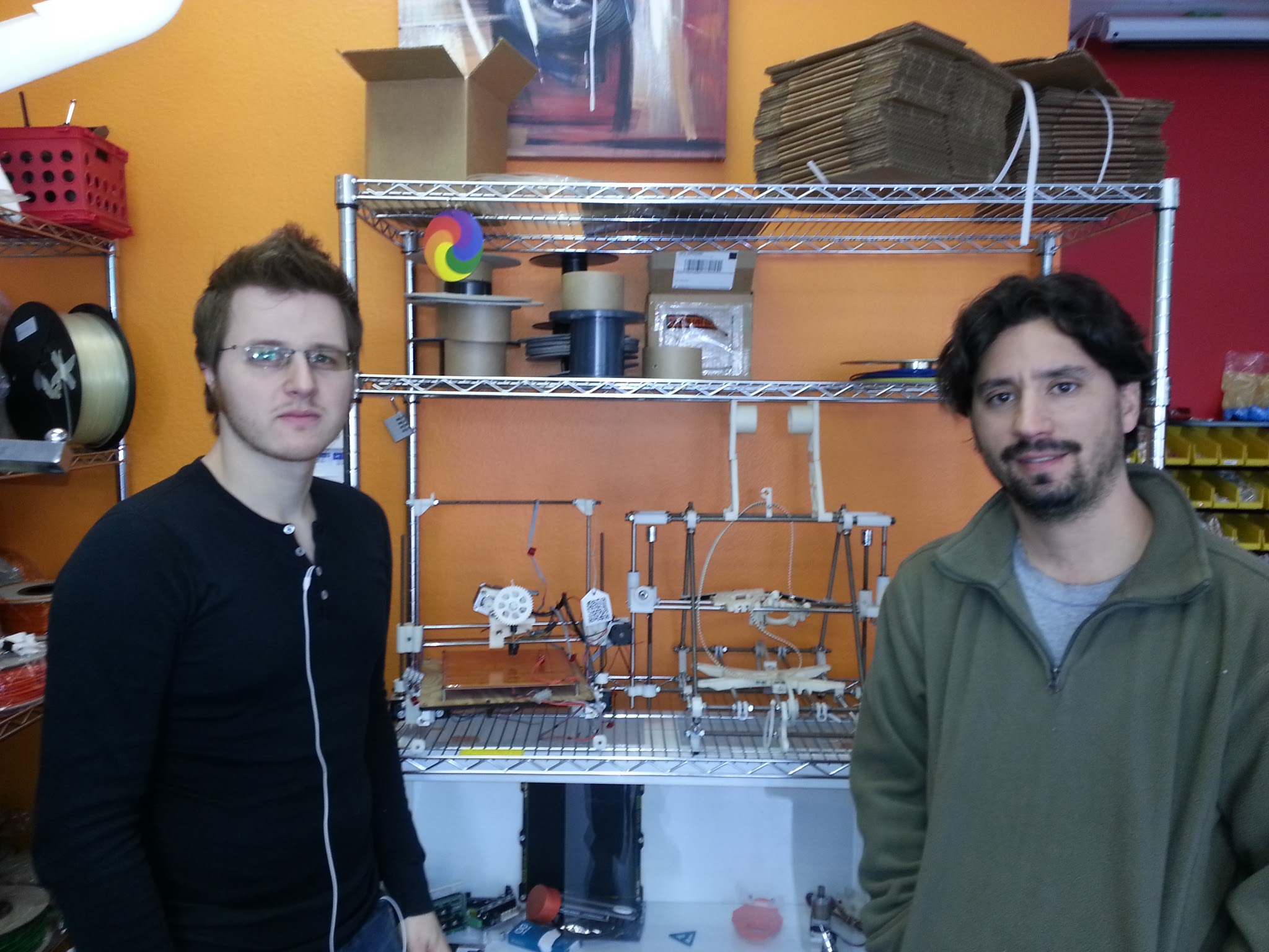 Rich and Diego at Deezmaker in Pasadena. Read about them in Make, and was thrilled that they are in the area. They have created a wonderful hackerspace and 3D printer store at 290 N. Hill Ave in Pasadena, CA. Two very smart guys with a great product and deep knowledge. Standing in front of some ‘older’ designs (Rich’s design on the left, Prusa Mendel on the right). Their Bukobot farm was hard at work printing more printers. http://deezmaker.com/