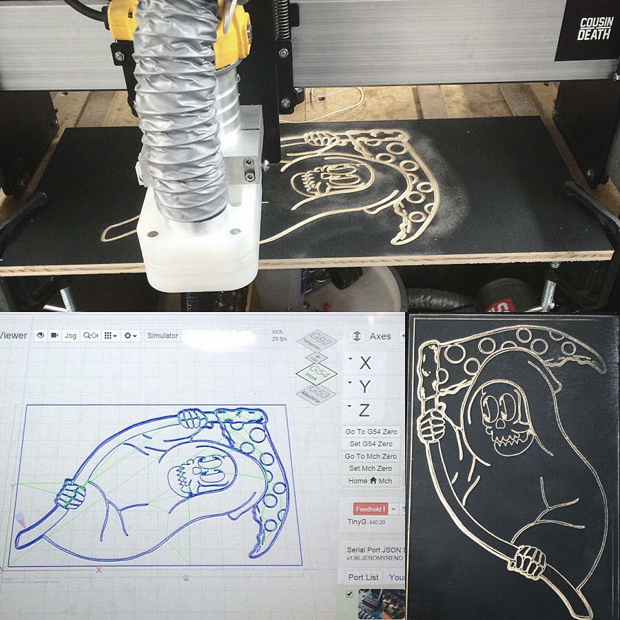 One of these days I’ll get around to trying powder coating. I’d love to do a black powdercoat, then tape it with polyimide, engrave it on the cnc, coat with some strong primary color down in the grooves, and pull the tape and see what it looks like. I bet it’d be fantastic.