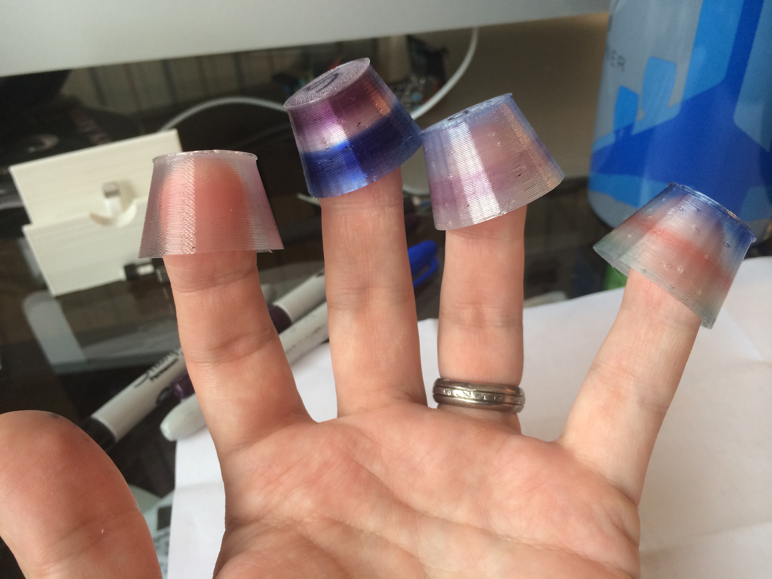 Conclusions: sharpie coloring works well. Color is more visible when doing more ink (obviously) or with a double shell. Darker colors show up better.