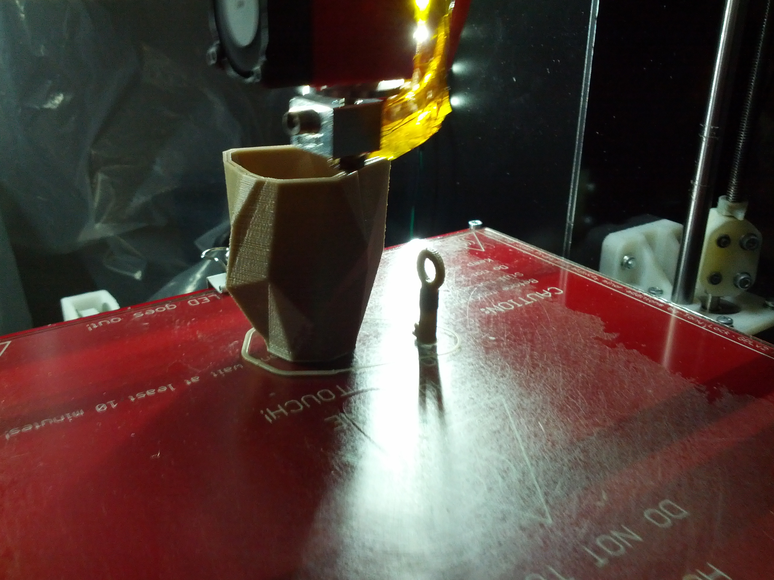 As you can see from the pictures, inter-layer adhesion is good, but the general surfaces produced are a bit sloppy. This might be over-extrusion, but as a lot of crackling and puffs of steam (or smoke?) came from the extruder during the print, I think the filament was fairly moist.