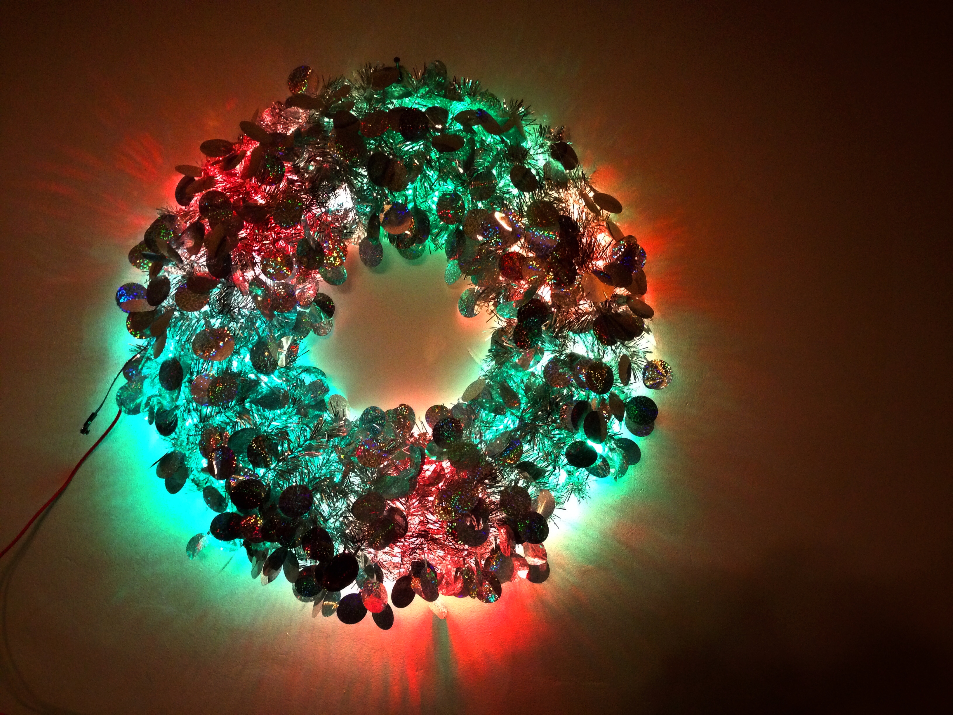 A $7.99 tinsel wreath caught my eye at the local Wallgreens. My daughter (11), who is totally on to me, saw the look in my eye and said No, dad, there’s no good way to put LEDs in that. Then she flipped it over, saw that it was only a hollow half-wreath with lots of room inside, sighed and put it in our shopping basket.