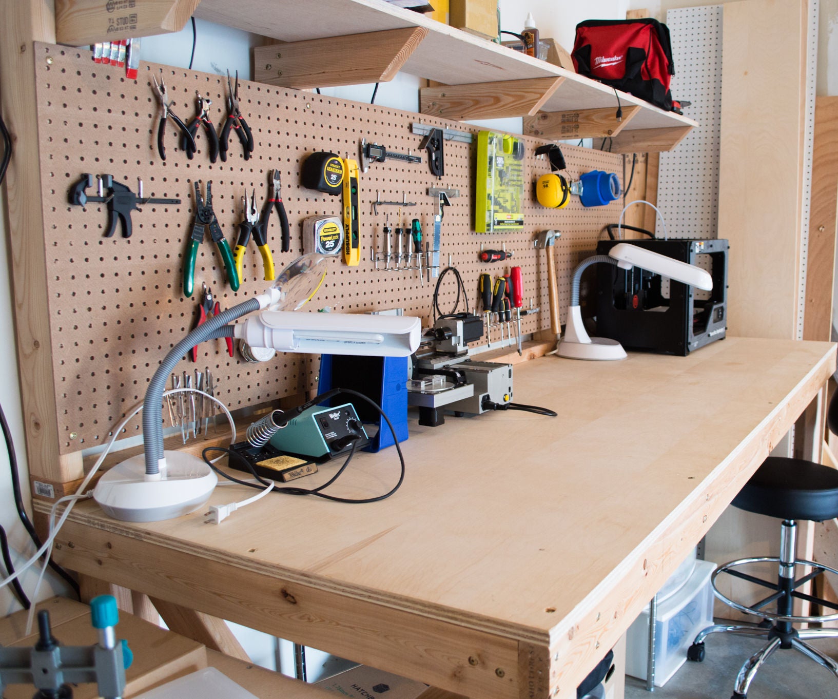 Since i moved recently and had to downsize and i am now sharing a room with my brother i find myself with a reduced area for my printing and soldering hobbies. Im looking to buy a new work table to set my stuff up on. What sort of setups do you guys have for your printers. A picture is worth a thousand words