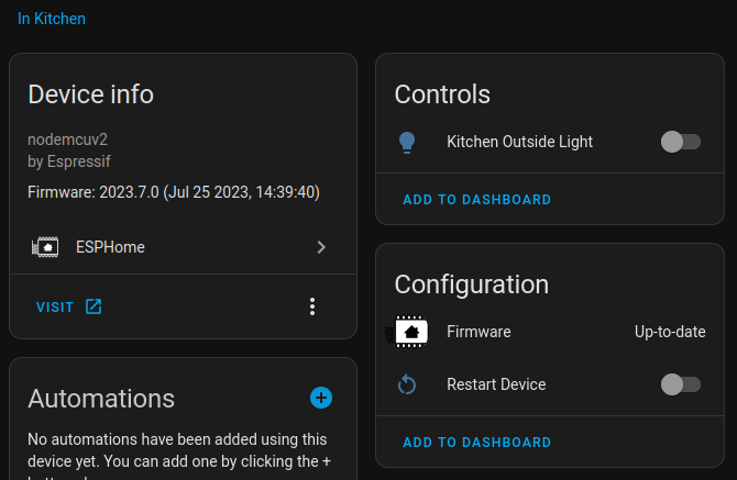 Uploading the initial firmware, after adding the device to ESPHome was done with an external USB-to-UART converter. All further firmware changes were made via OTA.