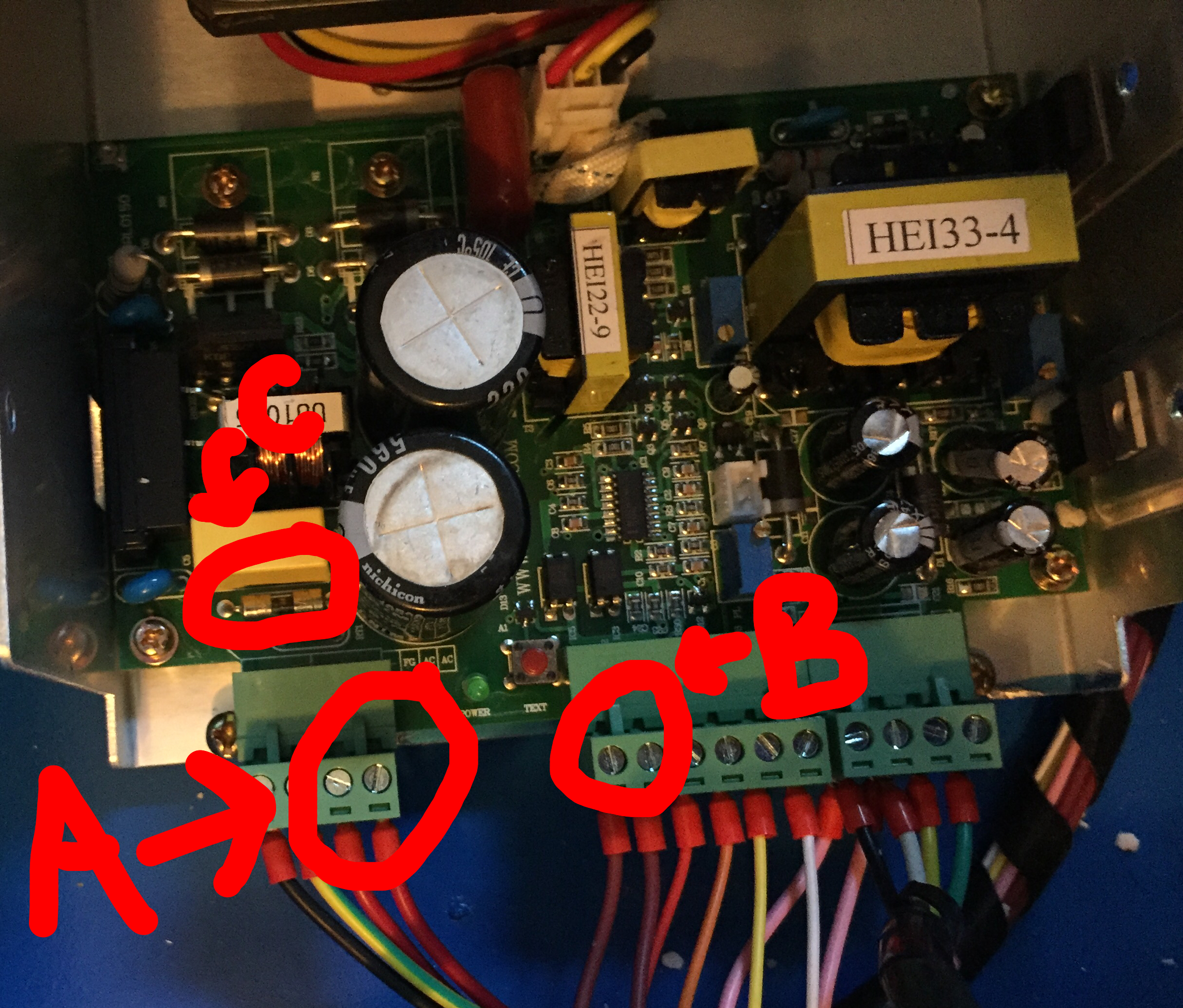 - green LED is off, Fan is not turning, AC input is present (marked A in image below) and output to secondary switch is NOT working (marked B in image below). Continuity on fuse © fails.