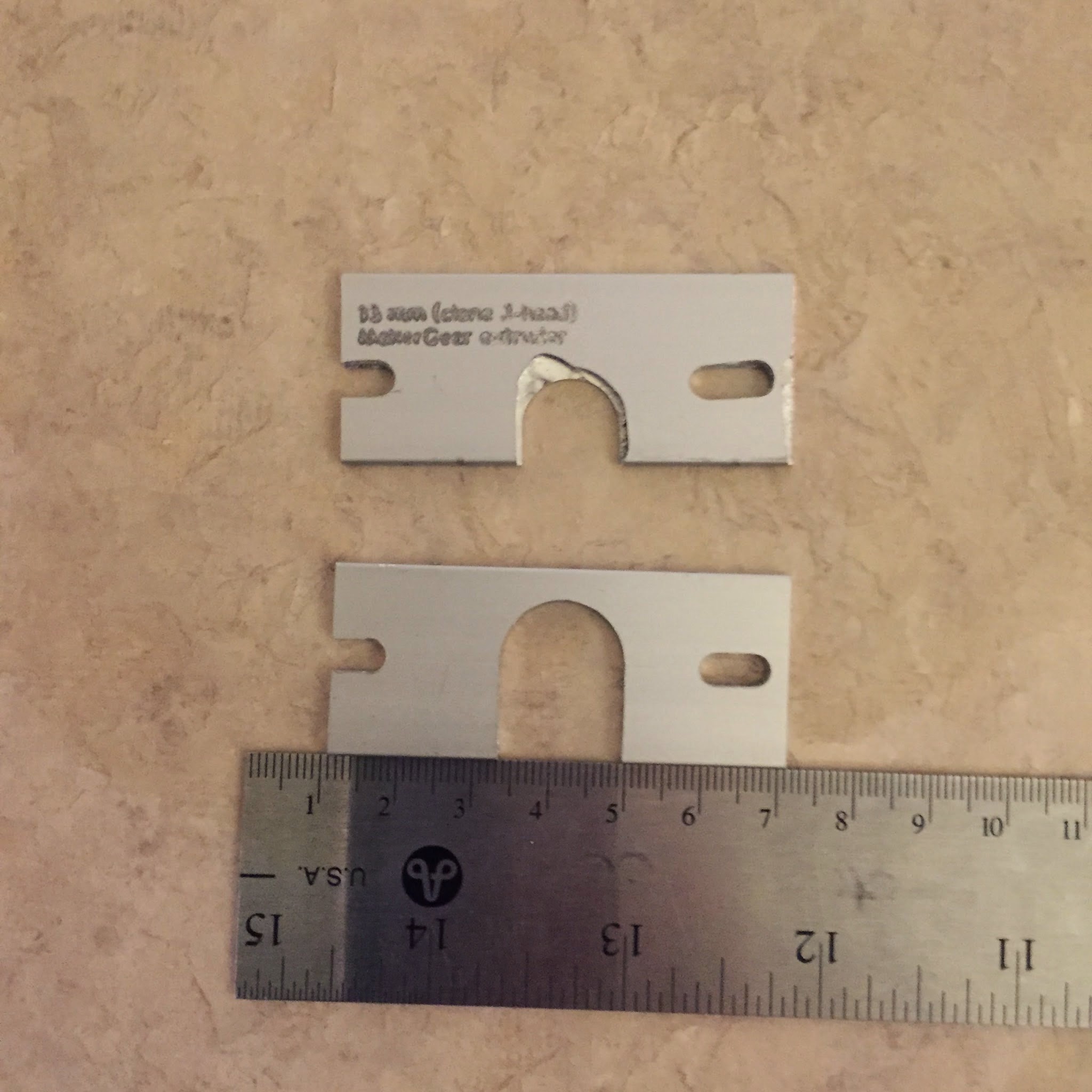So here’s last night’s handrolled and tonight’s CamBam-generated. I’ve discovered that 40mm/min with an ⅛" endmill is too fast (especially with 0.4mm cuts). Even 0.2mm cuts had chatter. The 0.4mm cuts were a mistake, I didn’t doublecheck the settings in CamBam. The right-hand slot is crooked because my Z axis is not very stiff in the Y direction and it deflected with the deep cuts.