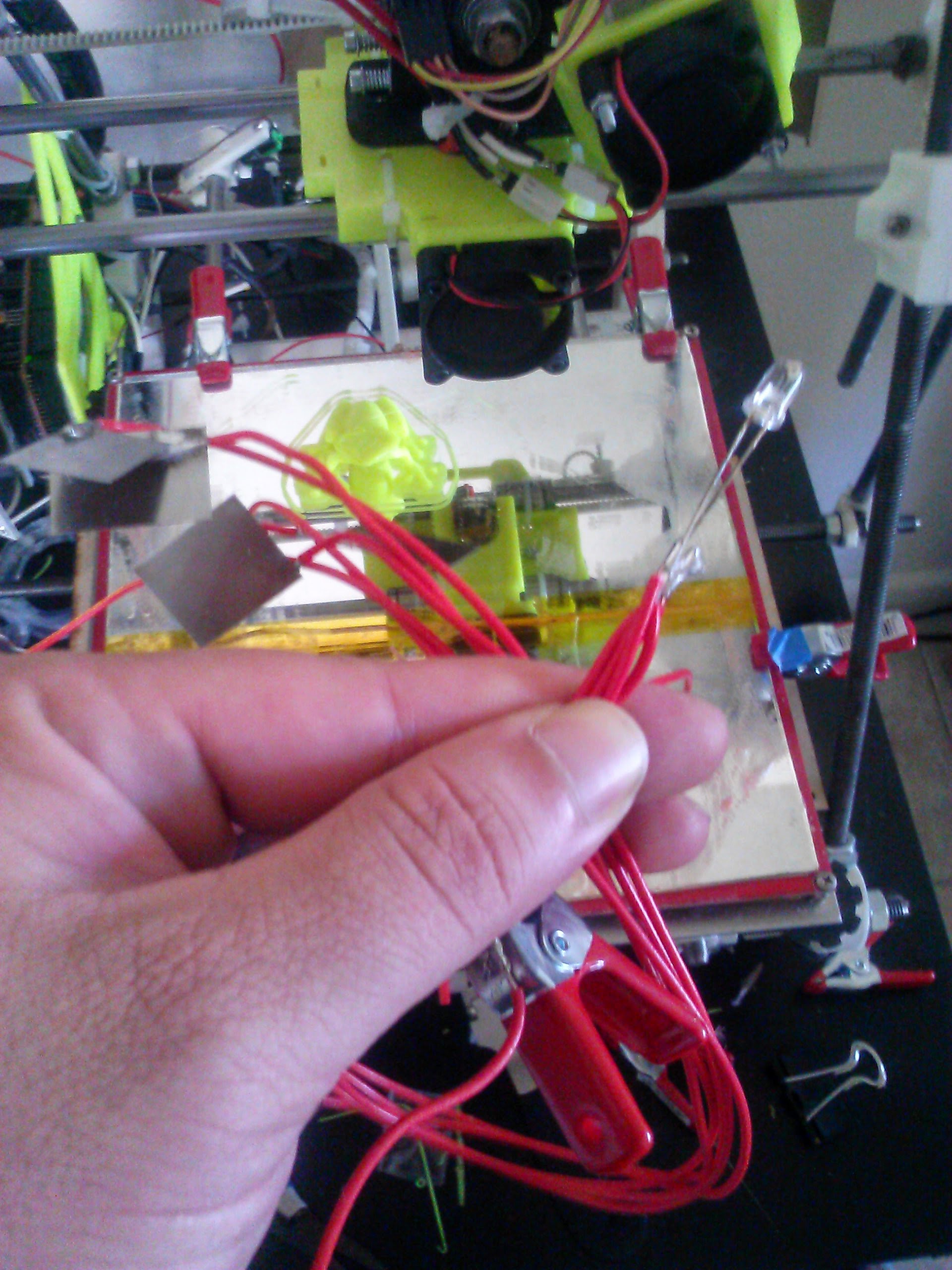 Each pad gets cliped to a corner of the bed, an aligator clip is attached to the hot end, the lead from the hot end is hooked up to 3.3v from the pi and the pads ground. You heat the bed, and move the extruder to your first pad.