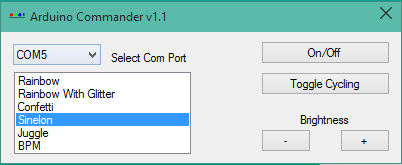 So I put together a VB application for communicating commands to the Arduino for things like lowering brightness or turning the LEDs on and off, or even selecting a pattern. See my project here: https://github.com/jbud/ArduinoCommunicationApp