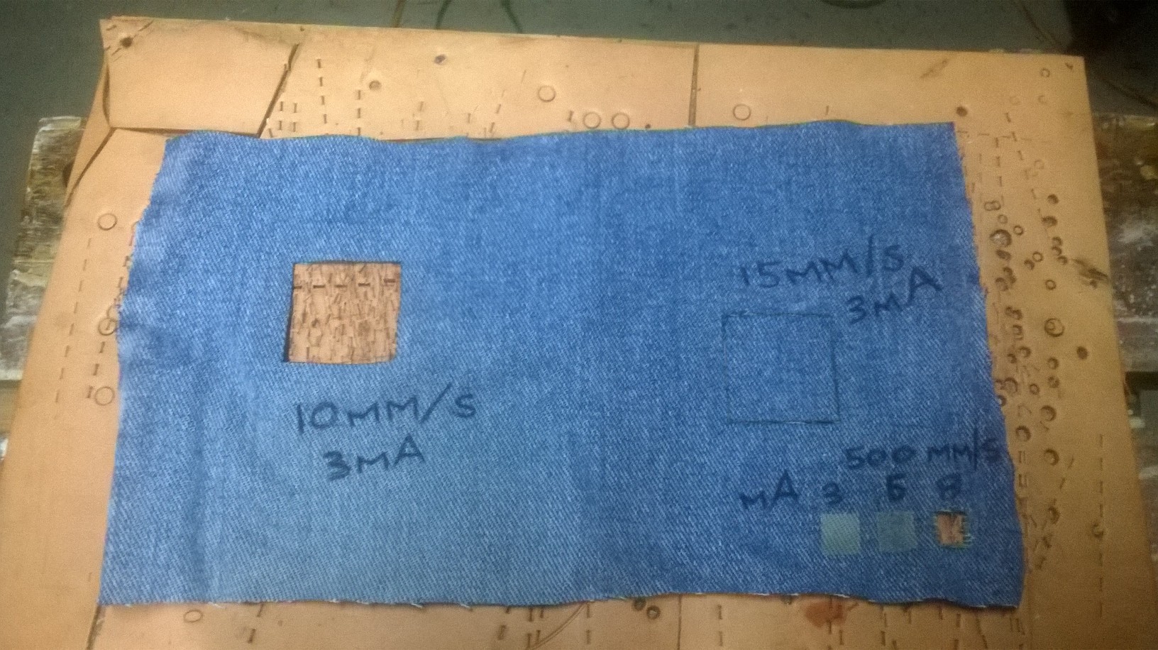 Then I dropped the power to somewhere around 5-6mA. Worked okay, but looked a little deep for my liking. Basically we just want to discolour the dye, not significantly weaken the fabric.