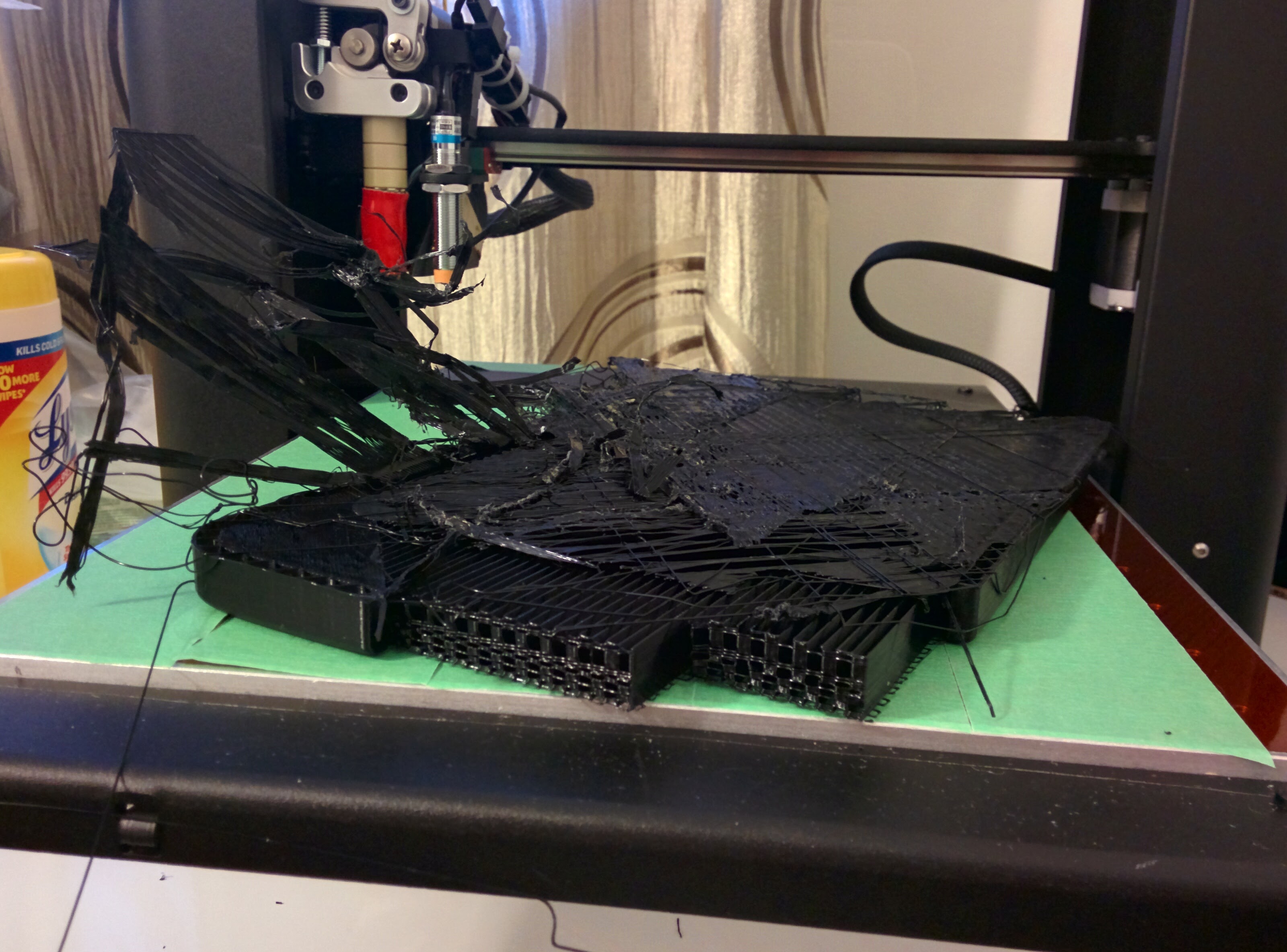So I tried my first big print and it failed spectacularly! My fault, poor orientation of the part I think. It’s a hard cover for an 8" tablet with a handle that I designed, I tried printing it with the handle to the top (same orientation as the render showing the handle.) and I used lines type support (Cura), everything went well until it tried to put that large surface down on the support and the surface became rough and uneven and the head scratch it off and eventually jammed.