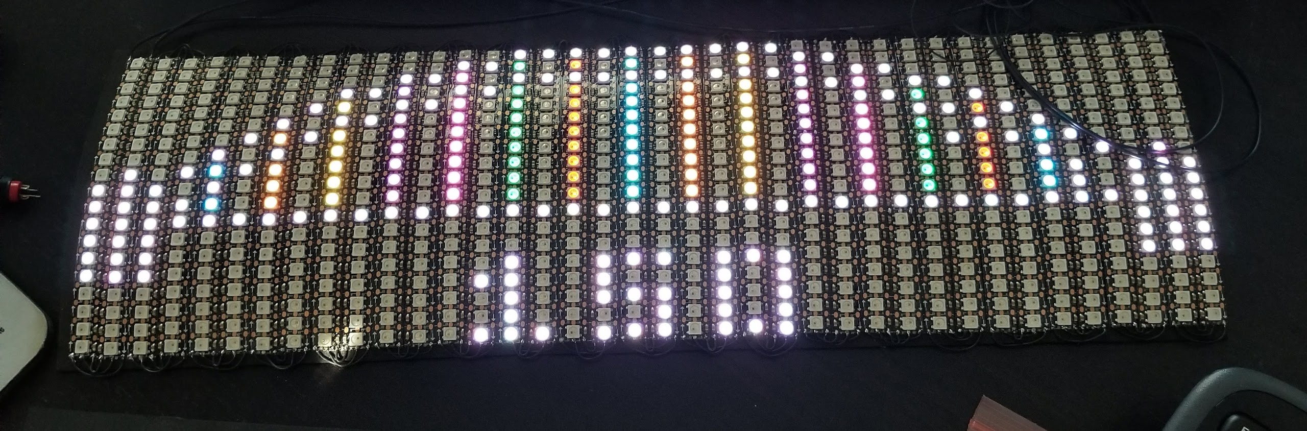 So I’m embarking on a big project (at least for me). I’ve created a matrix of LEDS 38x19 = 722 pixels. This is a wearable project so I set the brightness level to 35% or less so I don’t burn people’s eye out when wearing it.