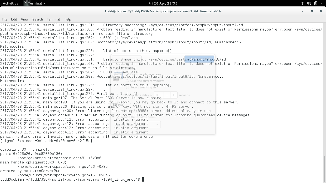 So I’ve switched to linux Debian distro. Kind of empowering and equally frustrating at the same time. I have determined that Chilipeppr can see a running JSON server and my USB0 port with either NodeMCU or Tiny G. However, no data can be sent or received. I have feeling it might have something to do with certs or keys? This is JSON screen shot in Verbose mode. Any suggestions?