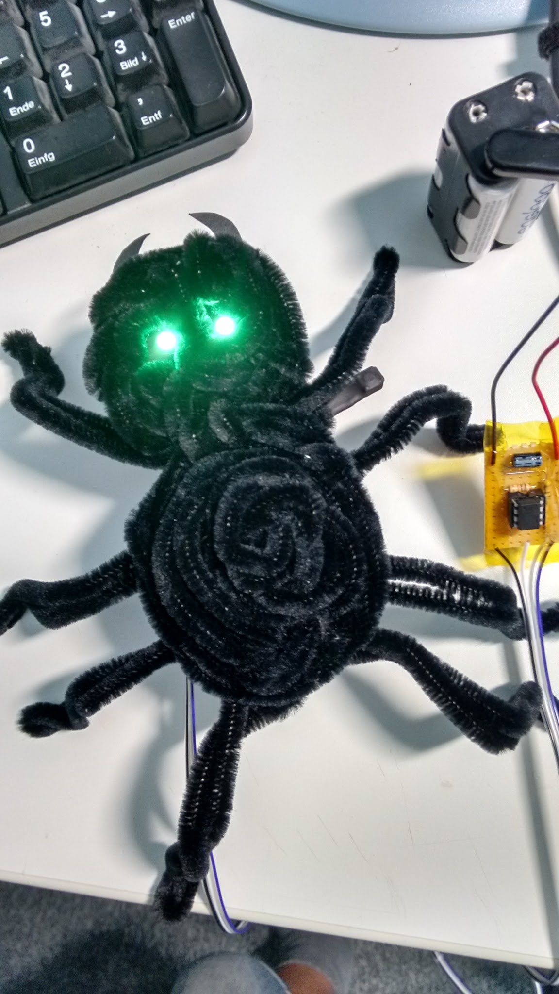 Two WS2812Bcontrolled by a ATiny85. Button to choose between red, green, blue, random and rainbow glowing eyes.
