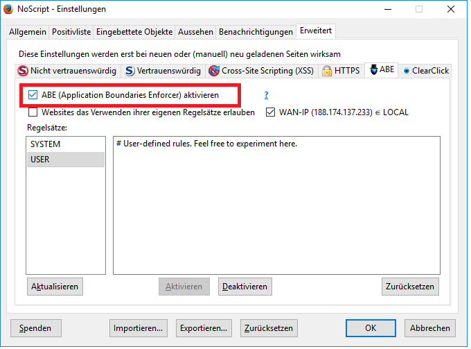 Some days ago I’ve tried to connect with chilipeppr to SPJS on my local machine running SPJS on ubuntu with no success. I tried it with FireFox on an other machine (Win10) with remote host connect with the same result. No connect possible. So I tried it with Chrome on that machine and works like a charm. Why it works with chrome and not with FireFox? I installed chromium on the ubuntu machine and that works too. After some debuging and WireShark’ing I found out that NoScript and the integrated ABE (Application Boundaries Enforcer) caused that problem. The access from cloud9 to the local resource (local intranet) with websocket are dropped. So in case of installed NoScript (2.9.5.2 in my case) disable the ABE or define a ruleset for the access to the local resource.