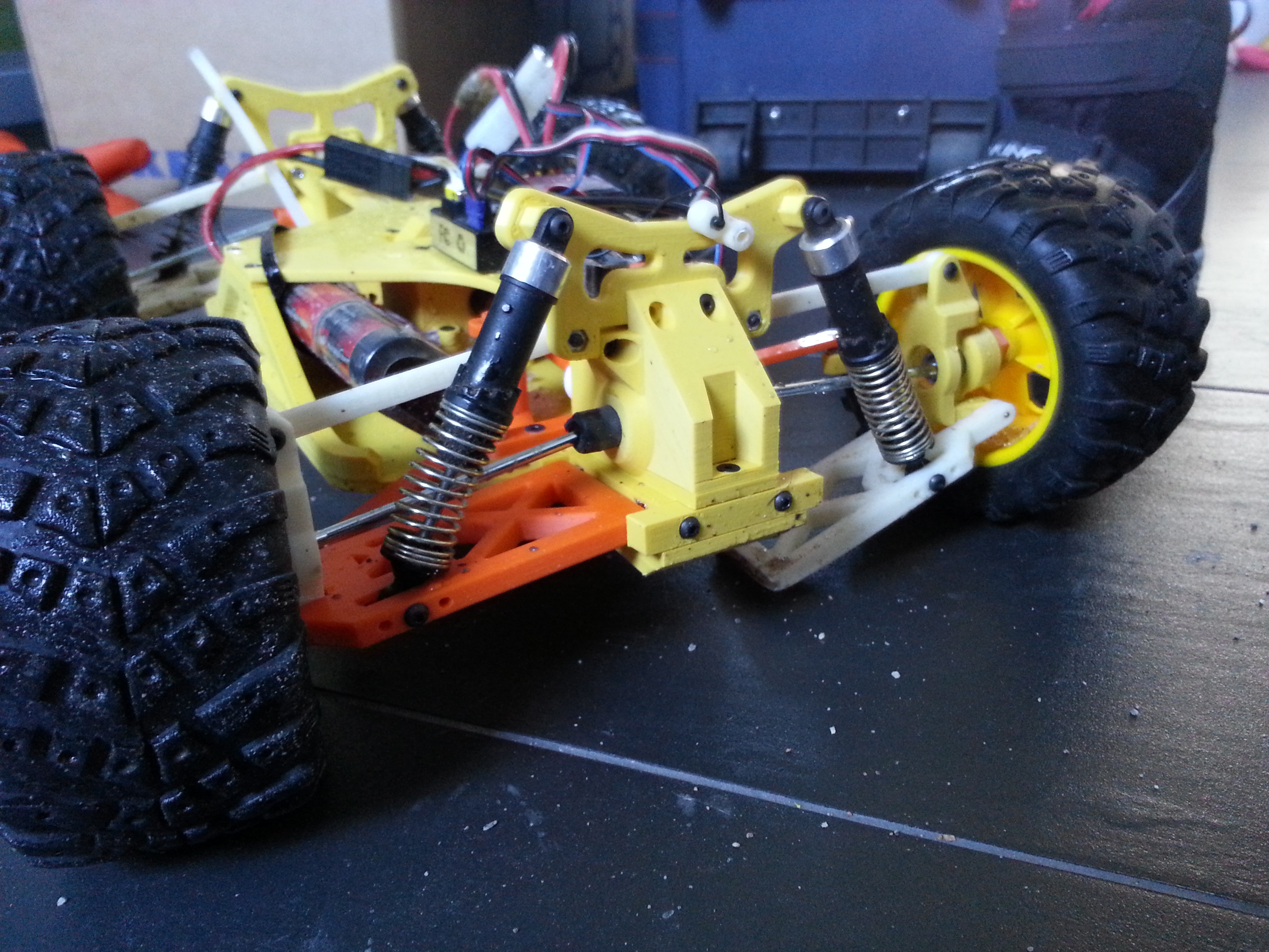 Some pictures from todays testdrive. Early on I broke one of the wishbones. The steering broke when the battery got loose and crashed into the steering. So I’ll add a battery fixation of some kind to the todo list.