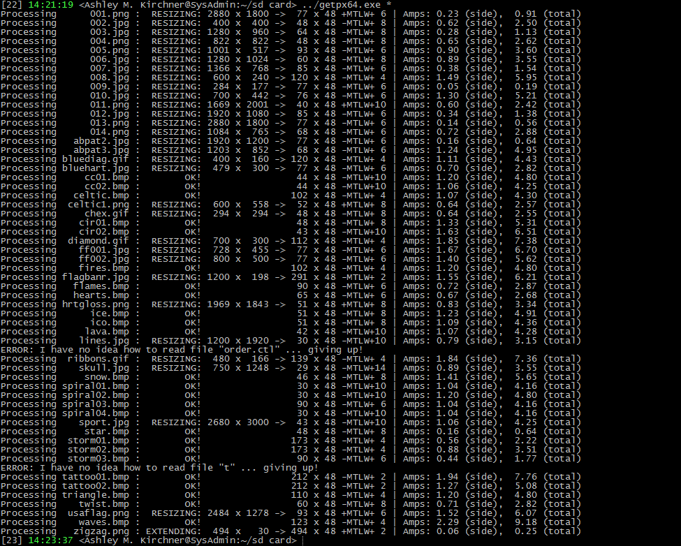 Someone asked me recently how I know what any particular image on my POVpoi would draw in amps (as in, how do I know the battery can pump out enough juice for the image.) Since I had already written a program that converts an image to the LED data I need, it was a matter of multiplying the values with 20mA and by the amount of pixels on a strip. Kinda fun to see this: